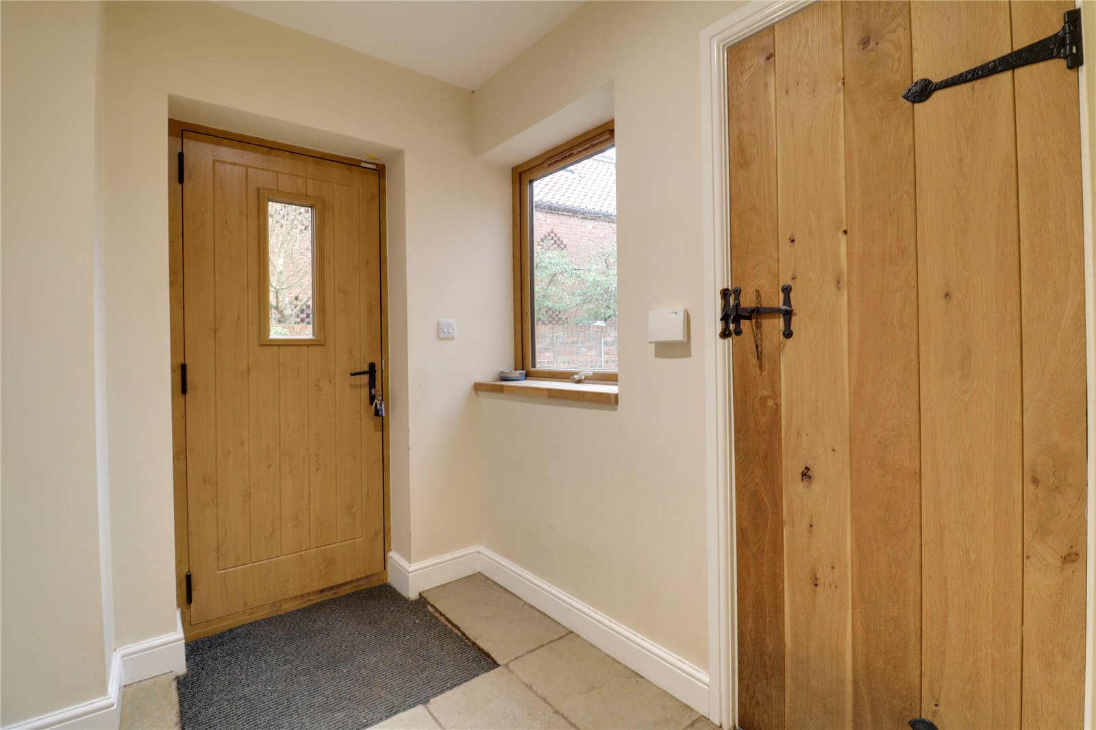 With a rear uPVC barn style composite entrance door with side uPVC double glazed window, wall mounted alarmed keypad and an opening leads through to;