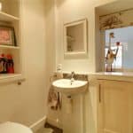 With a side hardwood double glazed window providing a two piece suite comprising a low flush WC and a wash hand basin, continuation of tiled flooring.