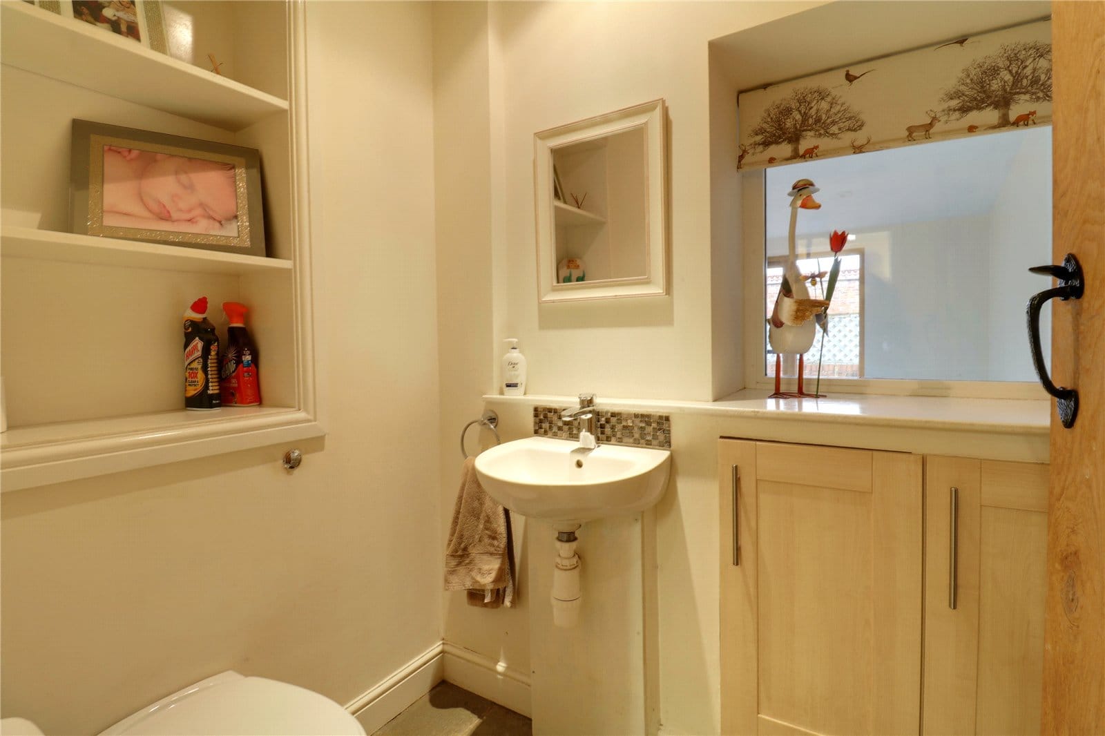 With a front woodgrain effect uPVC double glazed window, inset ceiling spotlights and twin built-in storage cupboards and a barn style door allows access to;
