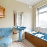 Rear uPVC double glazed window with patterned glazing providing a suite in blue comprising a low flush WC, pedestal wash hand basin, panelled bath with electric shower over, built-on storage cupboard with louver doors and wall to ceiling coving.