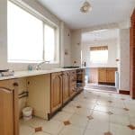 Rear uPVC double glazed window and side entrance door with patterned glazing, medium oak base units with worktop above, plumbing and space for appliances and tiled flooring.