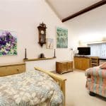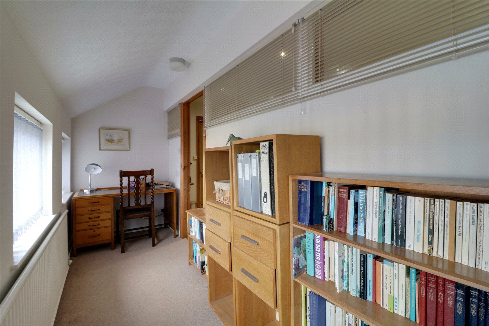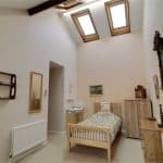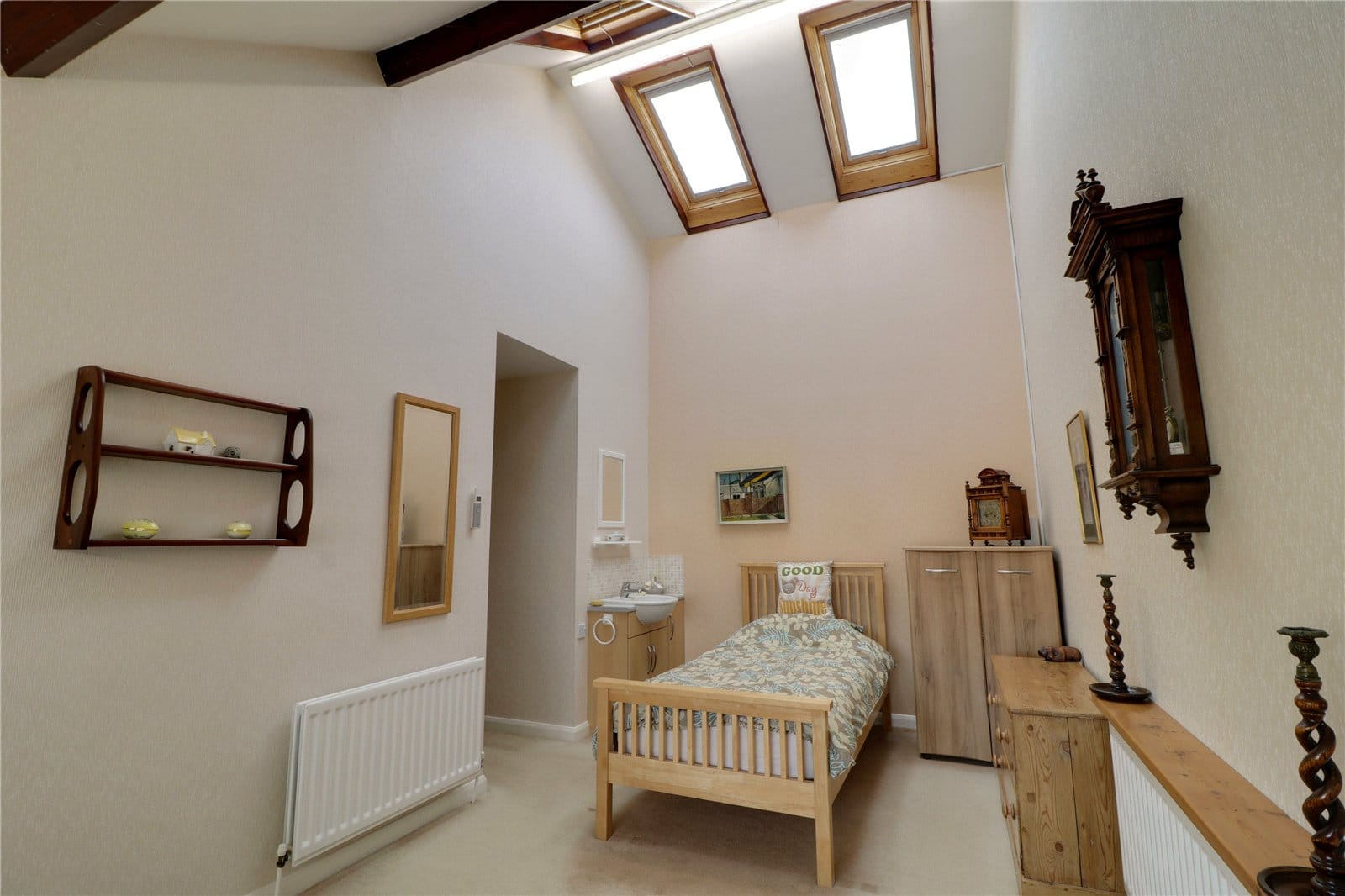 Front uPVC double glazed window, feature vaulted ceiling with four Velux roof lights with fitted blinds and vanity unit with wash hand basin.