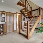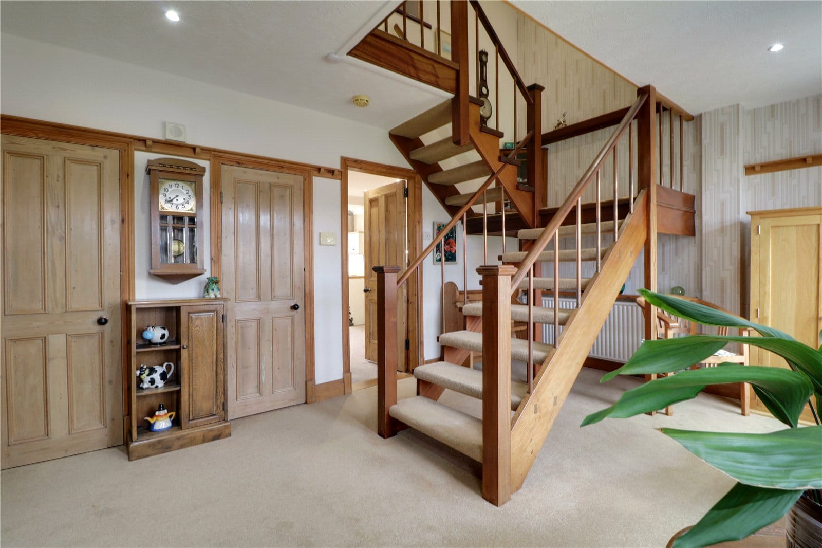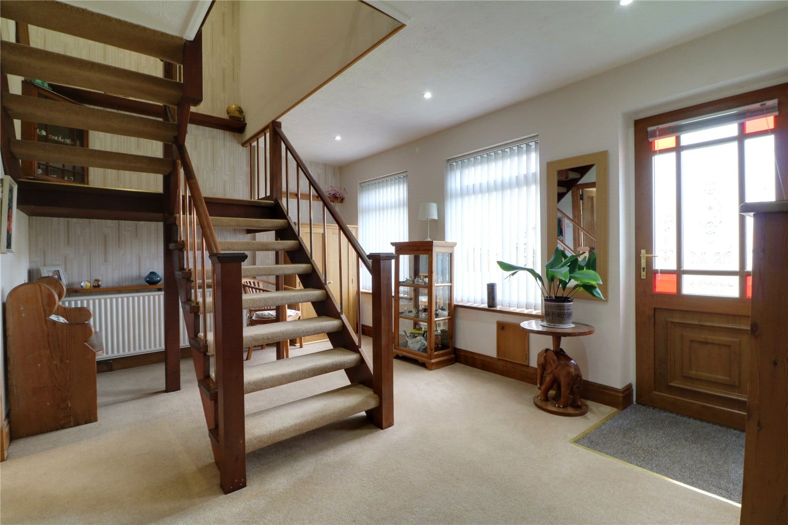Front woodgrain effect uPVC double glazed entrance door with patterned glazing with adjoining front uPVC double glazed windows, return open thread staircase leads to the first floor accommodation, inset ceiling spotlights and built-in storage cupboard.
