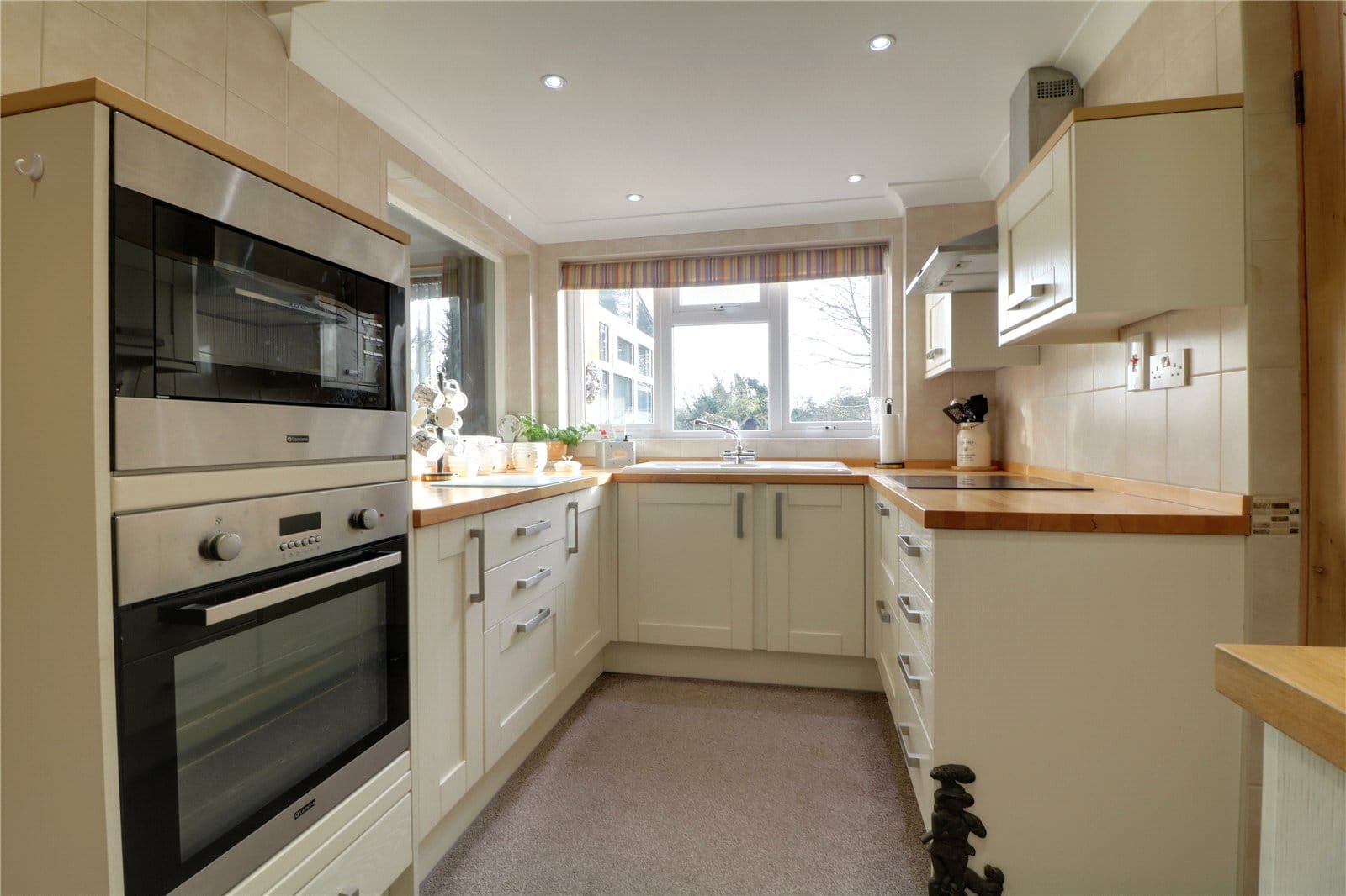 With a rear uPVC double glazed window. The kitchen is generously fitted with shaker style furniture with brushed aluminium style pull handles with a complementary butcher block worktop incorporates a one and a half bowl ceramic sink unit with drainer to the side and block mixer tap, built-in electric hob with overhead stainless steel canopied extractor and eye level oven and microwave, tiling to walls and internal panel and glazed door leads through to;