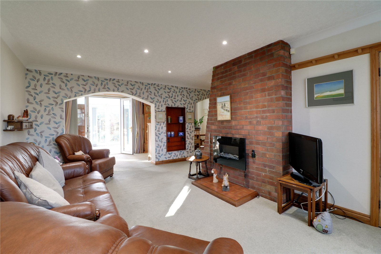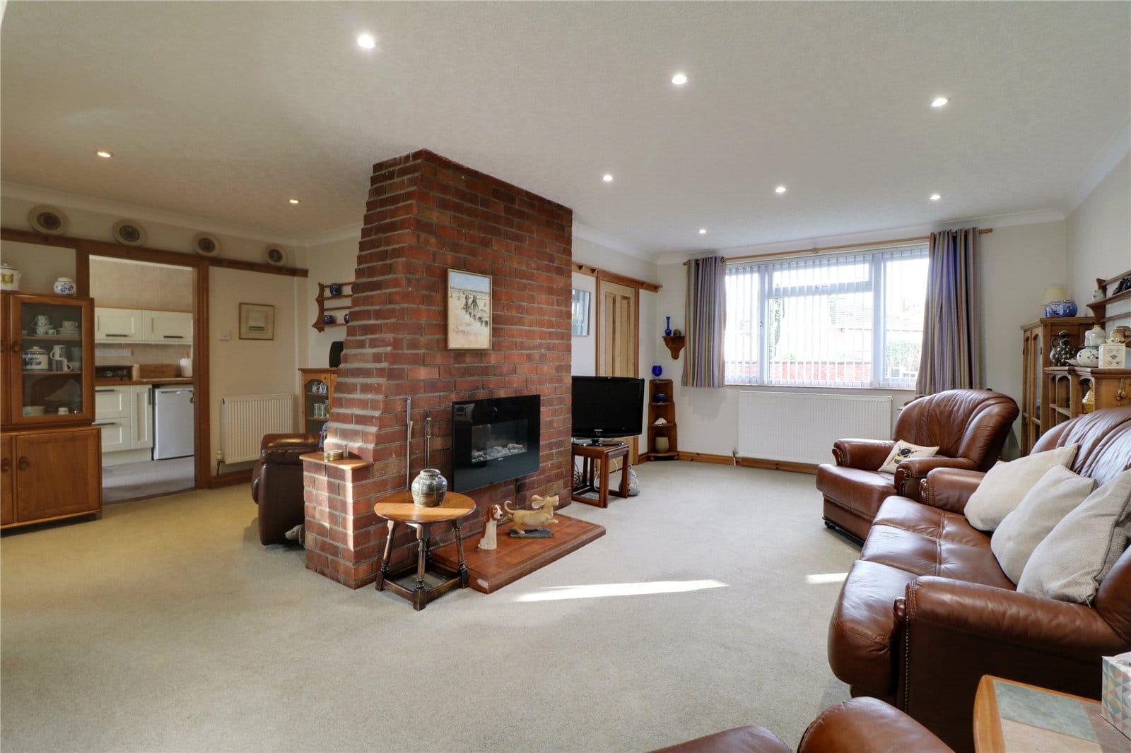 Front uPVC double glazed window, brick built fireplace with wall mounted modern electric fire with projecting tiled hearth with opening to;