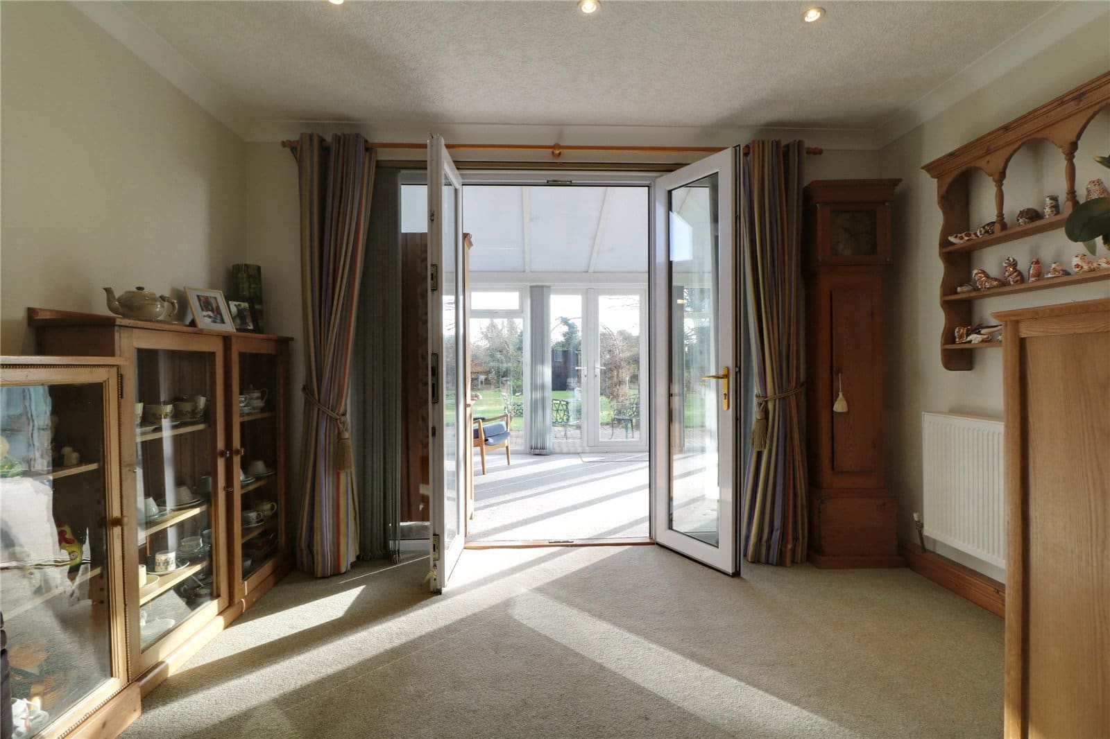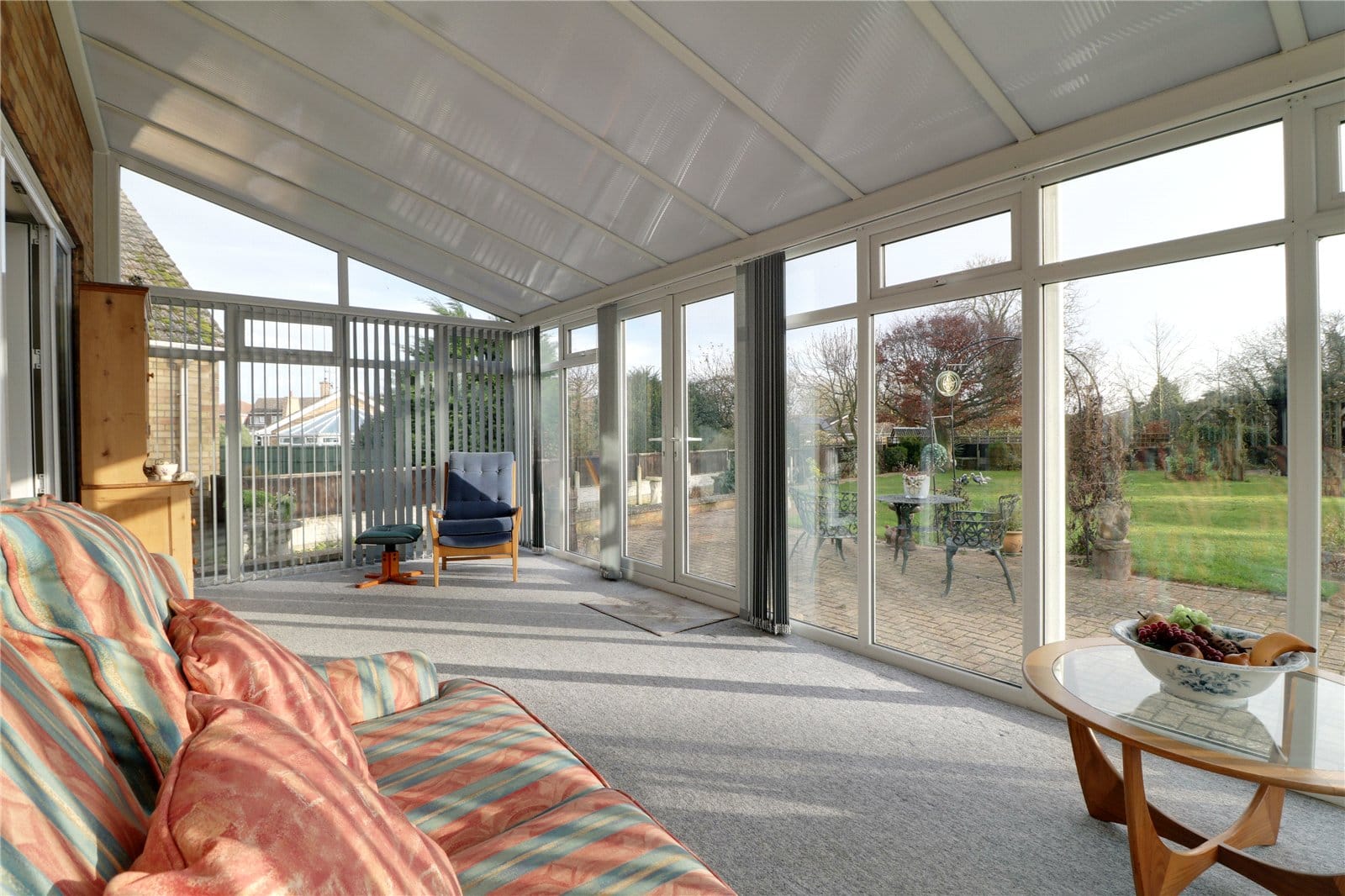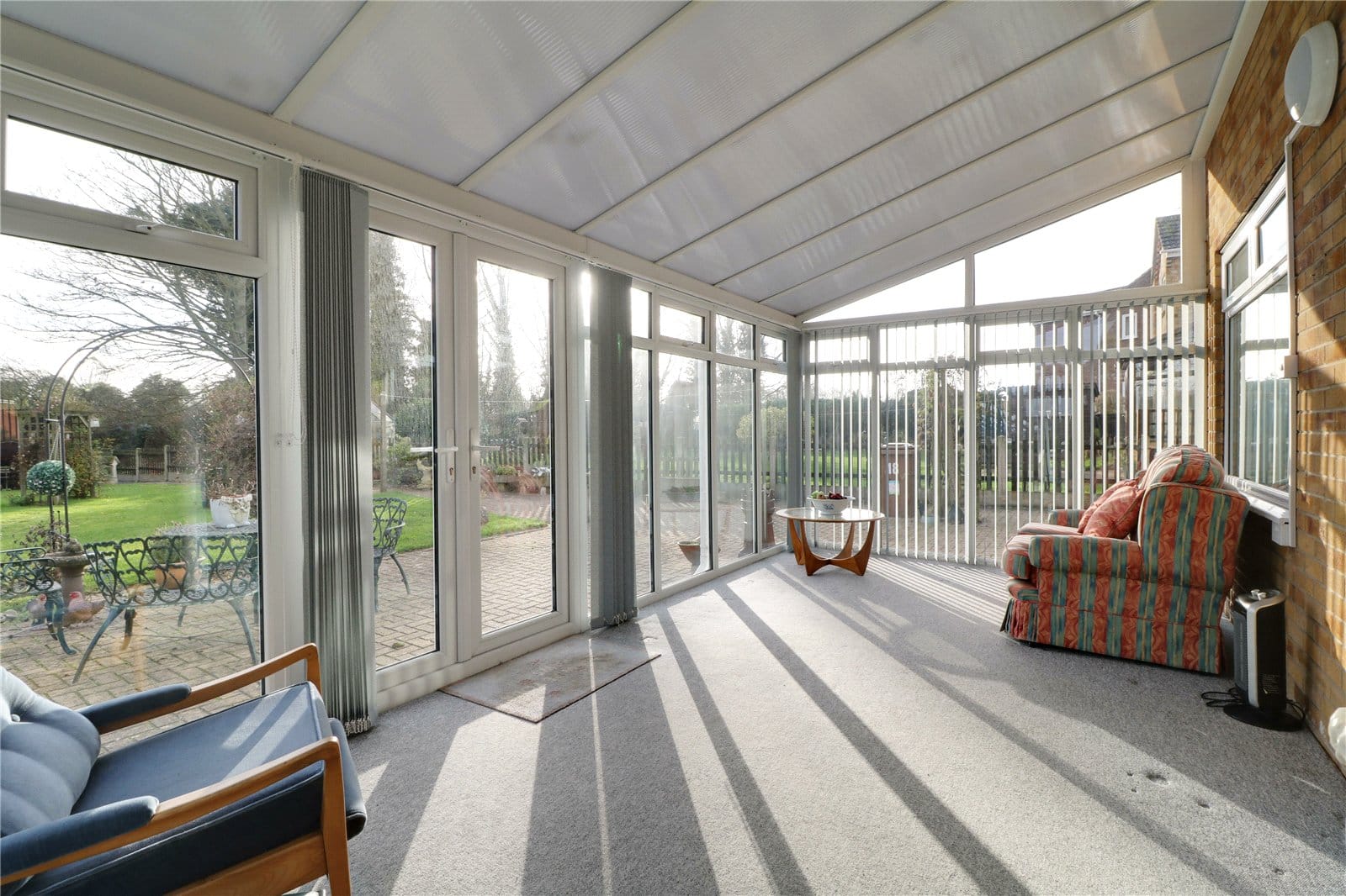 Being of uPVC construction with rear French doors leading to the garden and a polycarbonate sloped ceiling.