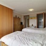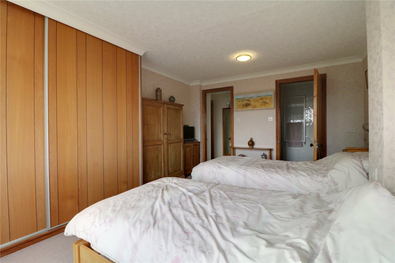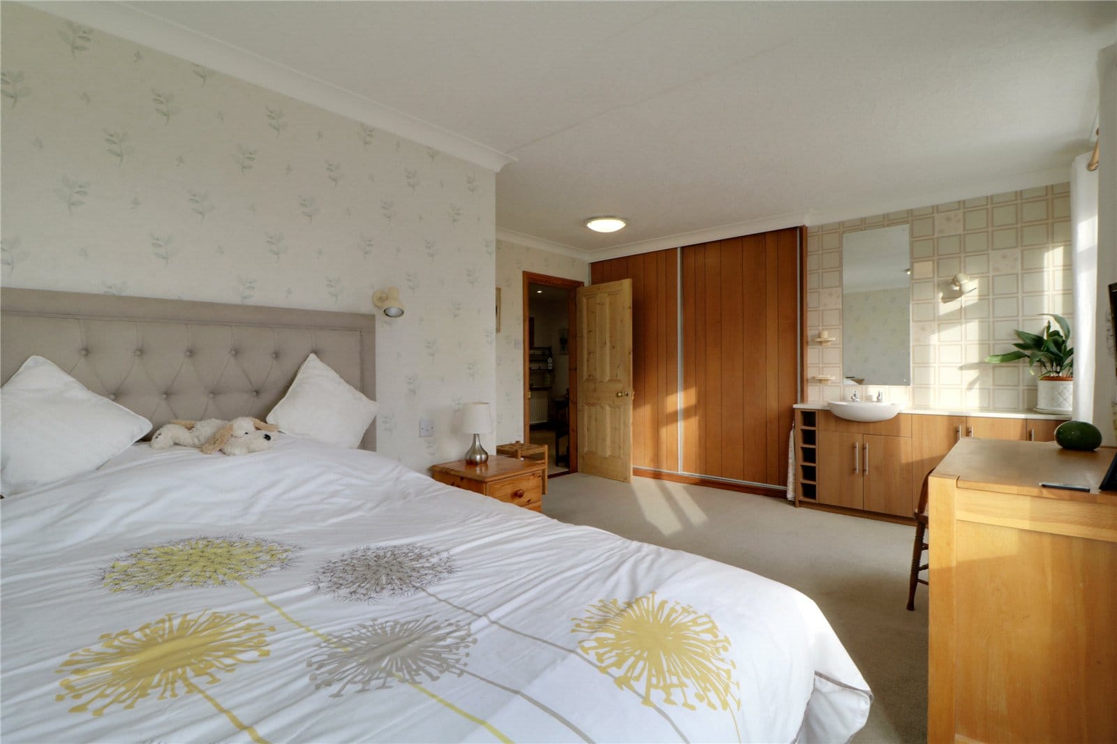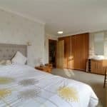 Rear twin uPVC double glazed windows, fitted vanity unit with a patterned top incorporating a wash hand basin and built-in wardrobes with sliding doors.
