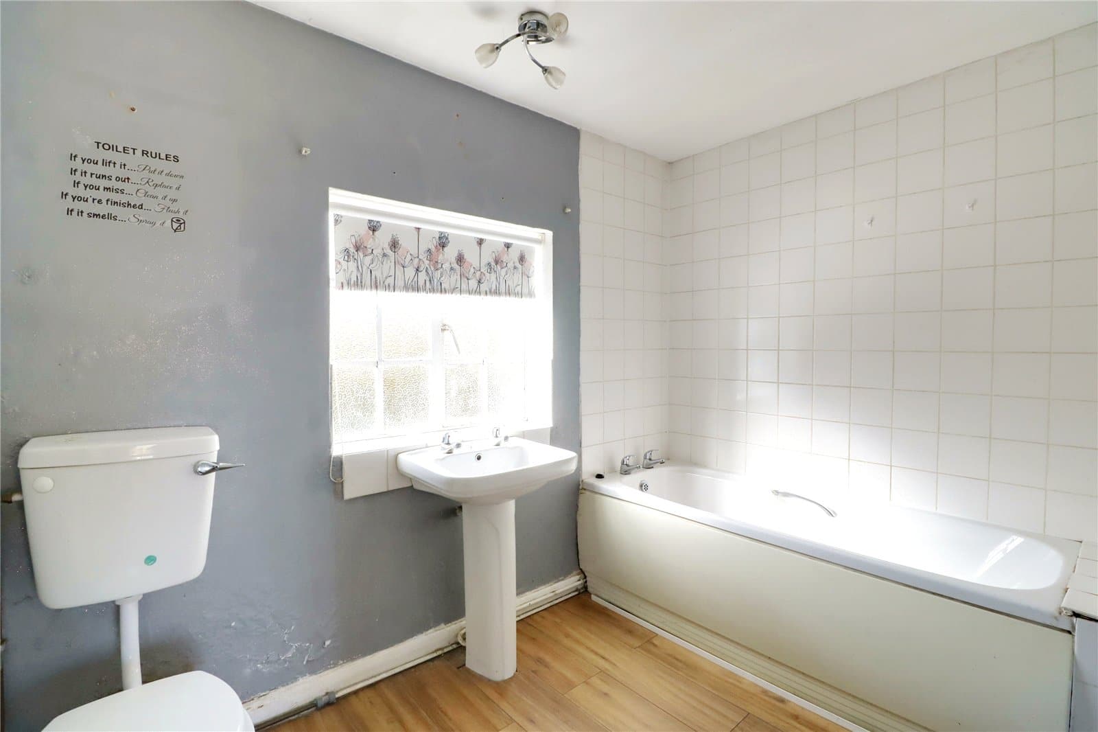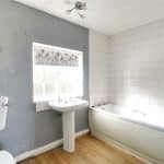 Side metal casement single glazed window with patterned glazing, a three piece suite in white comprising a low flush WC, pedestal wash hand basin, panelled bath with surrounding tiled walls and laminate flooring.