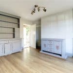 Side single glazed metal casement window, laminate flooring and doors through to;