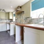 Two side metal casement windows, rear hardwood entrance door, a range of shaker style fitted kitchen furniture with butcher block effect worktop incorporating a single stainless steel sink unit with drainer to the side and block mixer tap, space for appliances, concealed Valliant gas central heating boiler and tiled flooring.