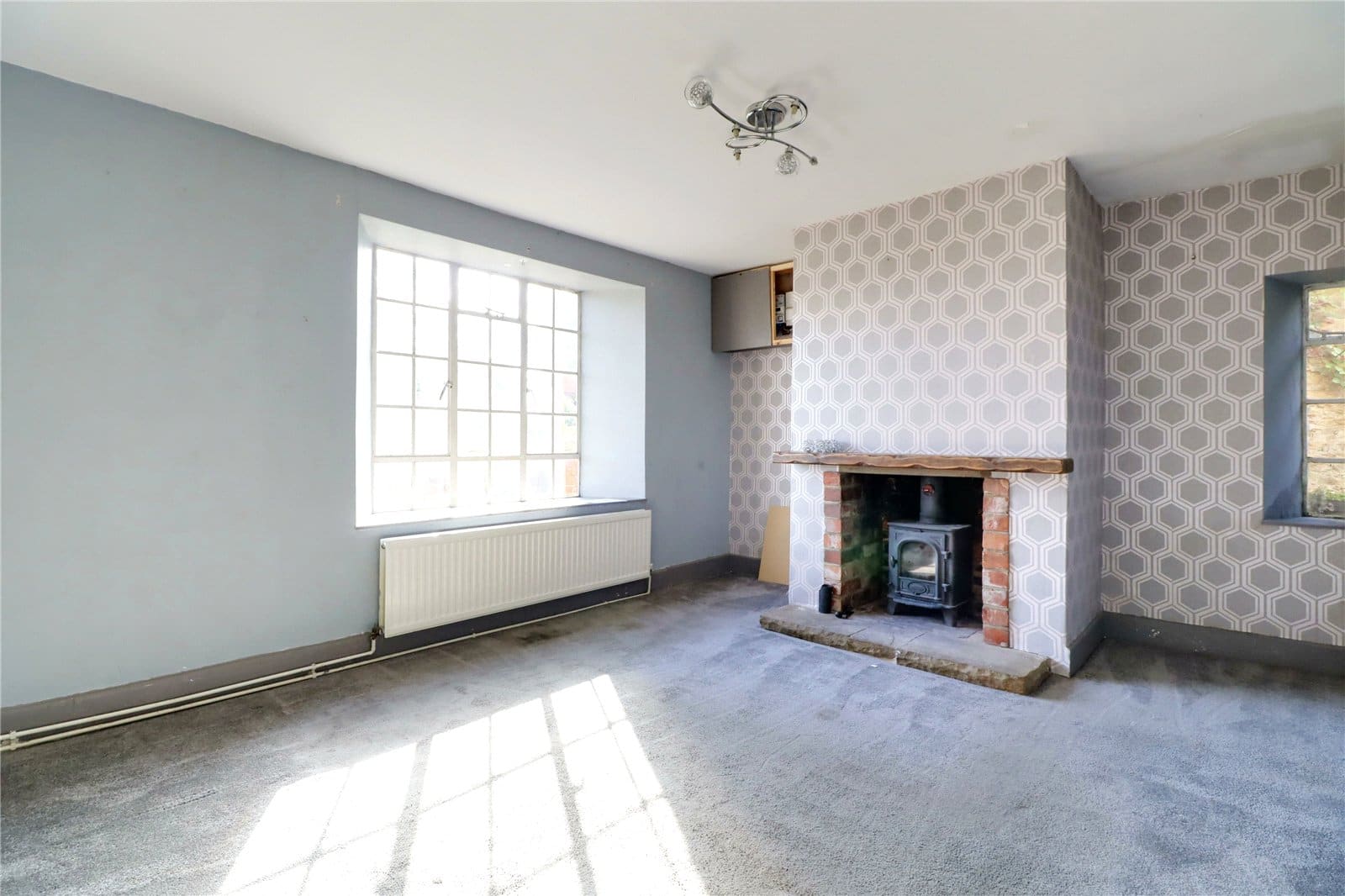 Benefits from a dual aspect with front and side metal casement windows, feature multi fuel cast iron stove within a brick chamber, projecting raised flagged hearth, wooden beam and mantel and meter box cupboard.