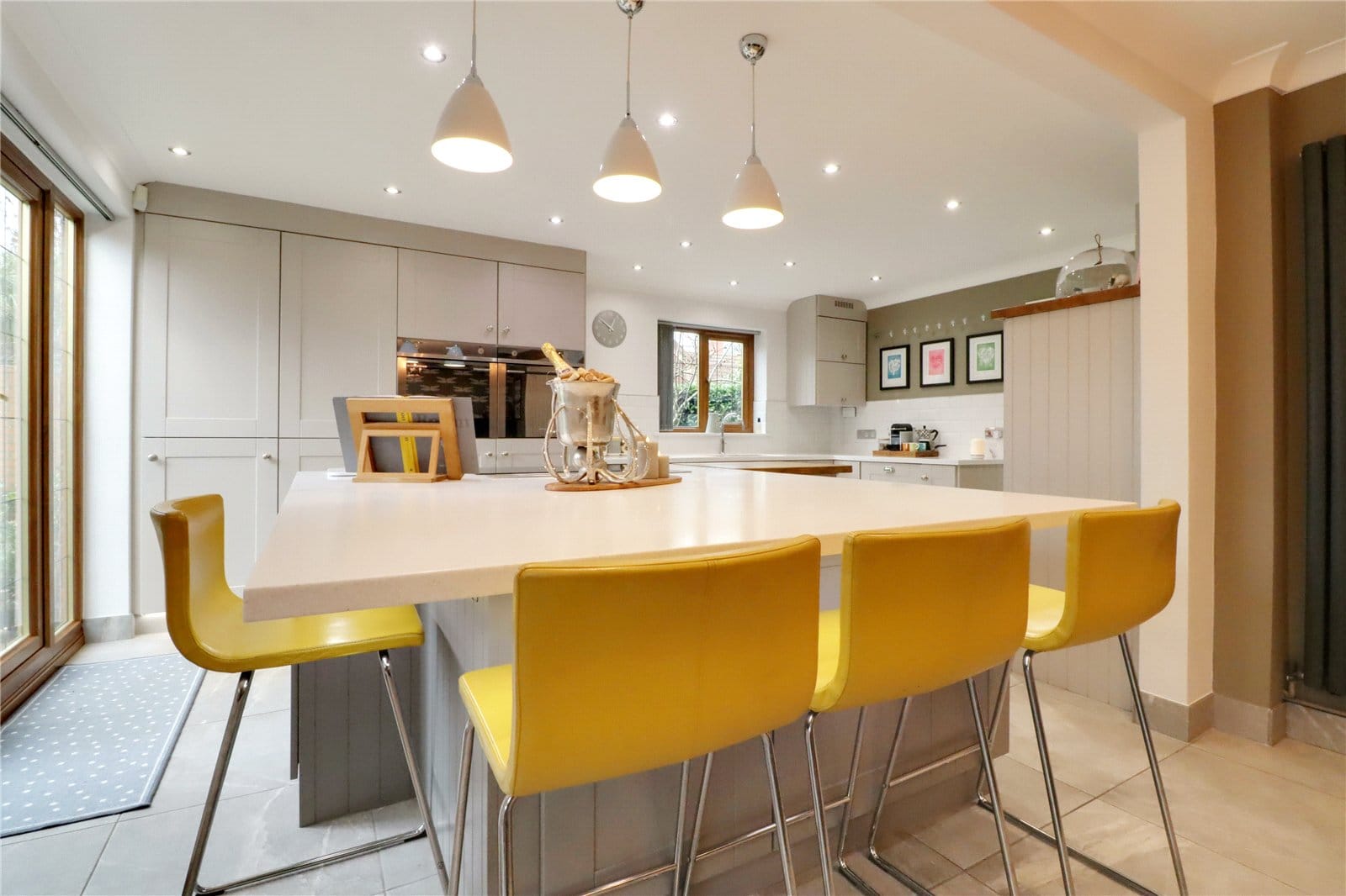With side light woodgrain effect uPVC double glazed and leaded window and matching rear French doors with adjoining side light leads to a private rear garden. The kitchen is generously fitted with a range of matching shaker style furniture with chrome cup and button pull handles with integral dishwasher, fridge freezer, enjoying a feature quarry and patterned worktop with matching uprising that incorporates a double stainless sink unit with etch drainer to the side, a central quooker block mixer tap, eye level double Smeg oven, feature central breakfasting island having a five ring electric hob with built-in lifting extractor, microwave and plate drawer and space for a wine cooler, tiled flooring, inset modern LED spotlights, double doors leading back through to the entrance hallway and broad opening leads through to;