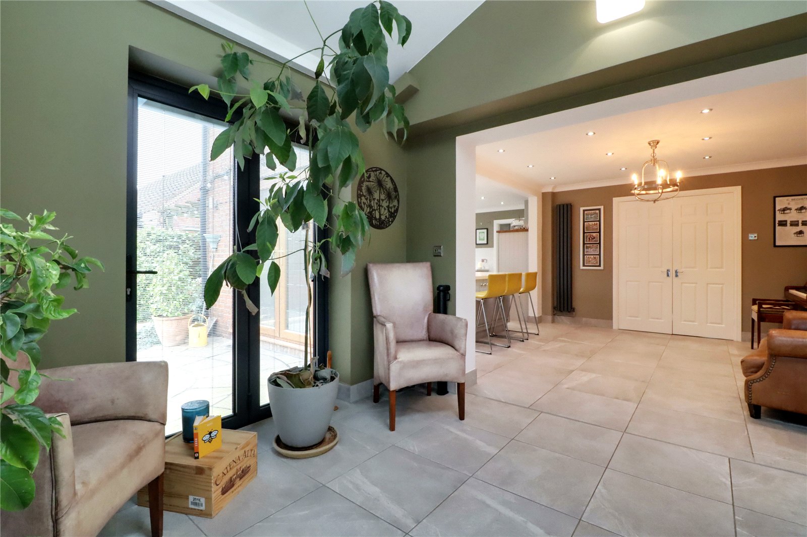 Enjoying a dual aspect with side and rear light wood grain effect uPVC double glazed and leaded windows, wall to ceiling coving, TV point and doors to;