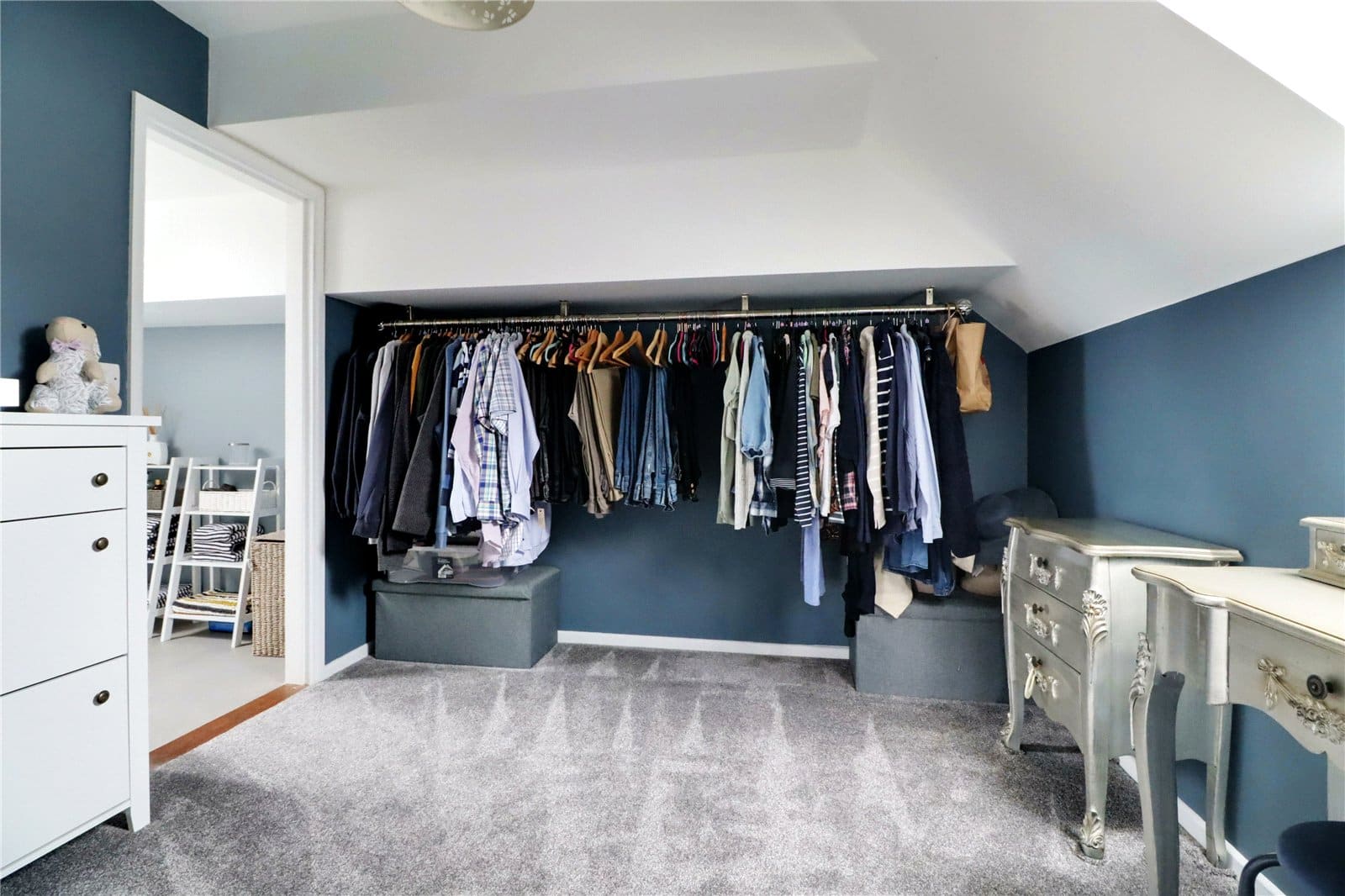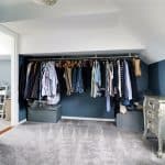 Side double glazed Velux roof light. fitted hanging rail and doors through to;