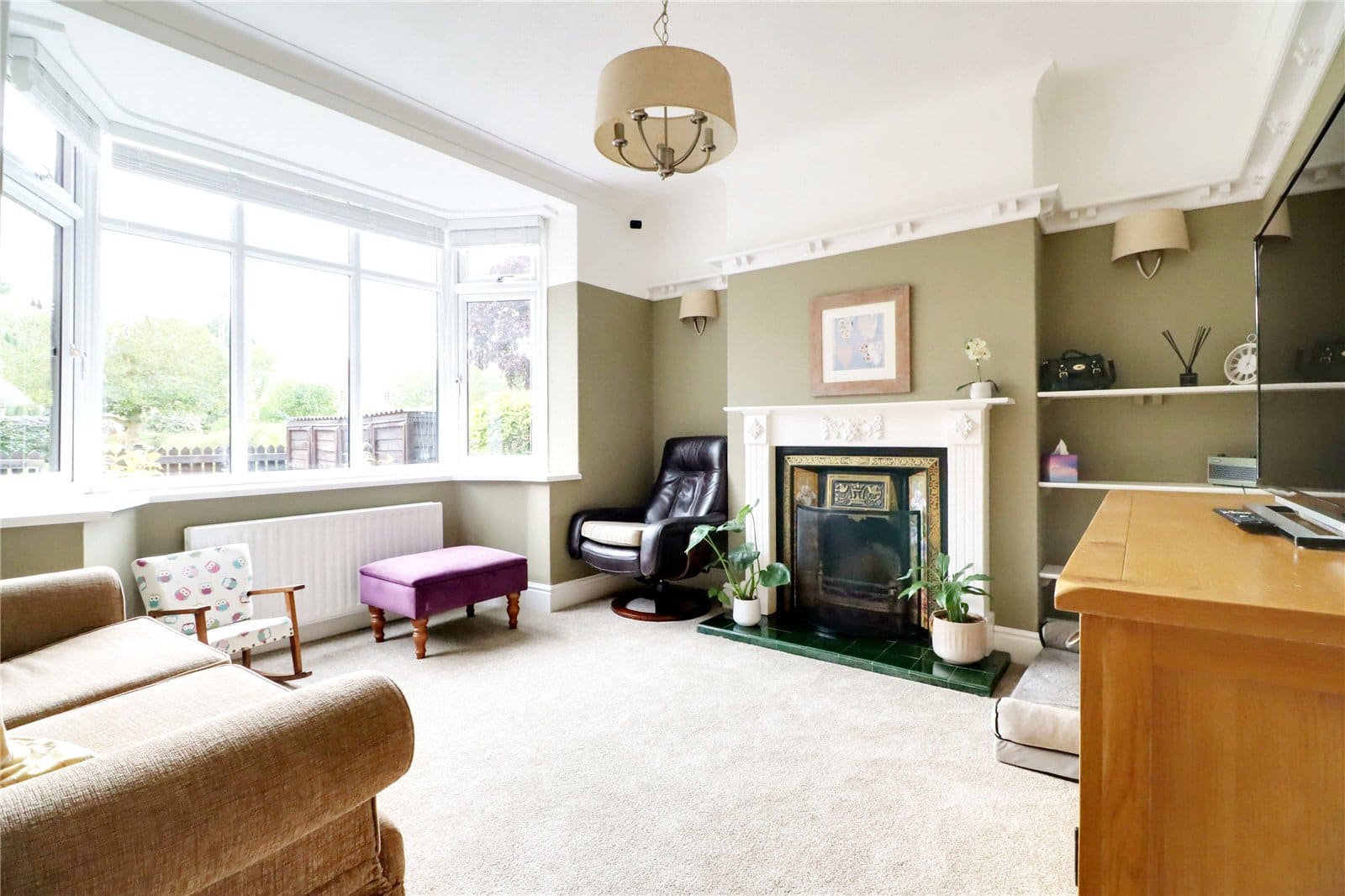Plus broad front uPVC double glazed bay window, handsome Victorian cast iron fireplace with inset tiled detailing, projecting tiled hearth and a carved wooden surround and mantel, display shelving to one side, picture rail, wall to ceiling coving and central ceiling spotlight.