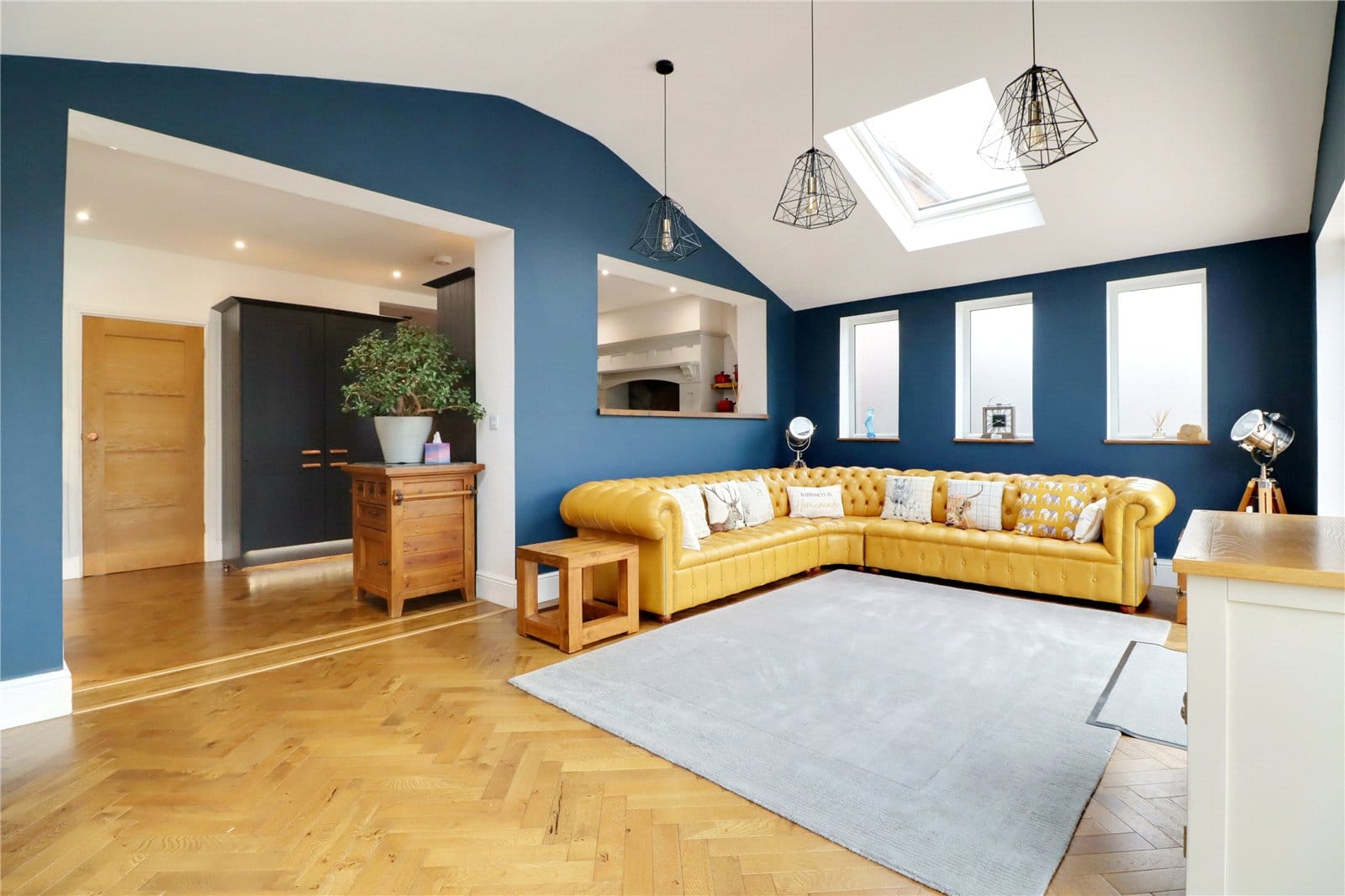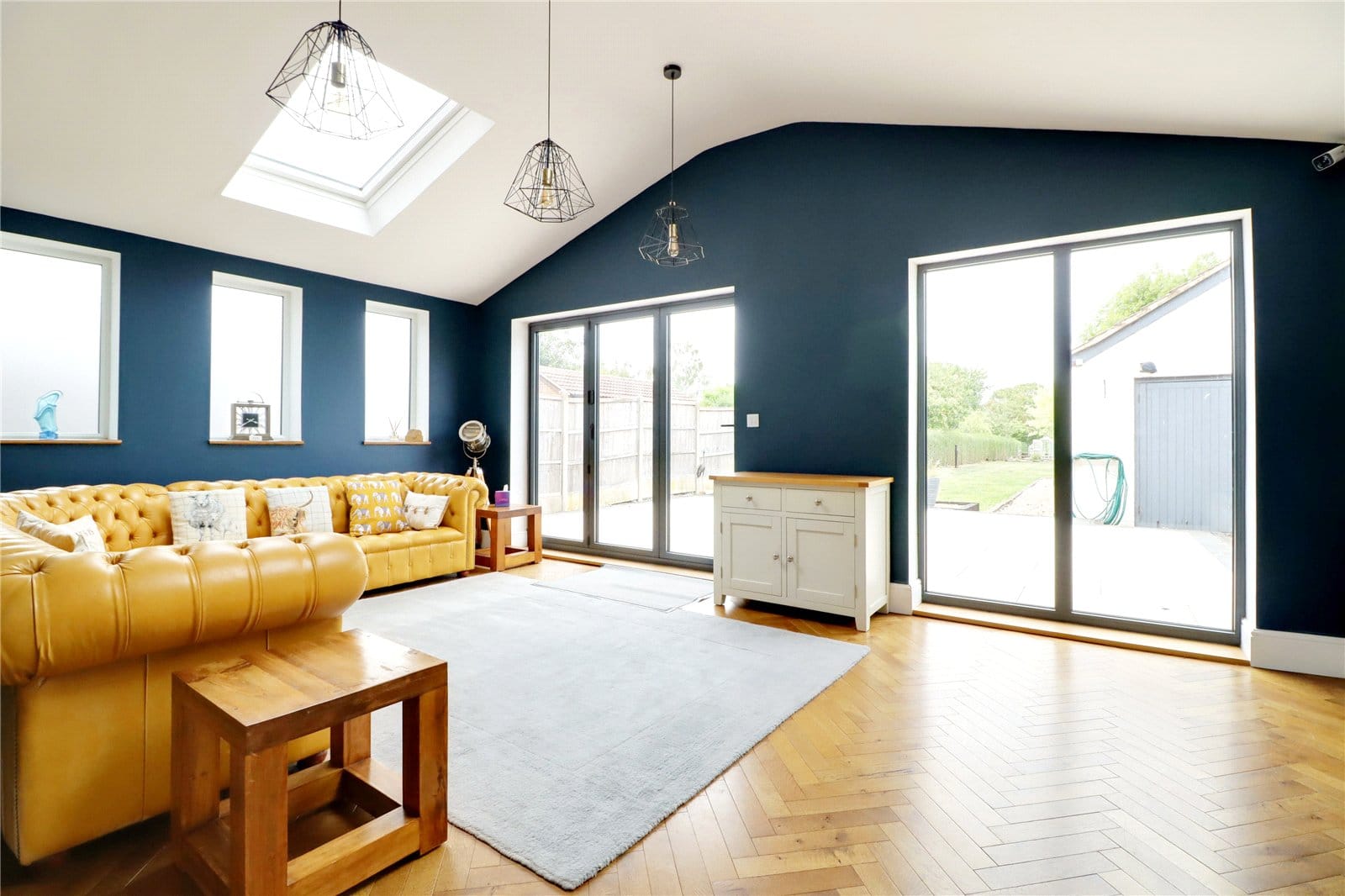 Three side uPVC double glazed windows with frosted glazing, large rear picture window and matching bi-folding doors leads to the garden, two double glazed roof lights, parquet flooring and TV point.