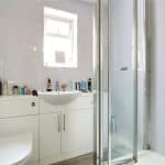 Side uPVC double glazed window with patterned glazing, provides a newly fitted modern suite in white comprising a close couple low flush WC with adjoining vanity unit with wash hand basin above, walk-in shower cubicle with glazed screen and overhead main shower, laminate flooring, mermaid boarding to walls with chrome edging and clad finish to the ceiling.