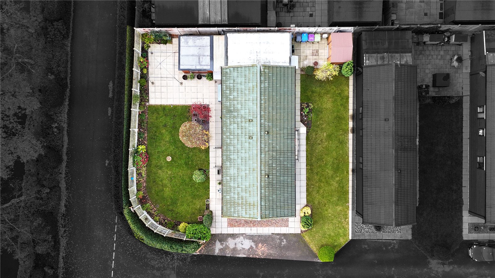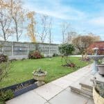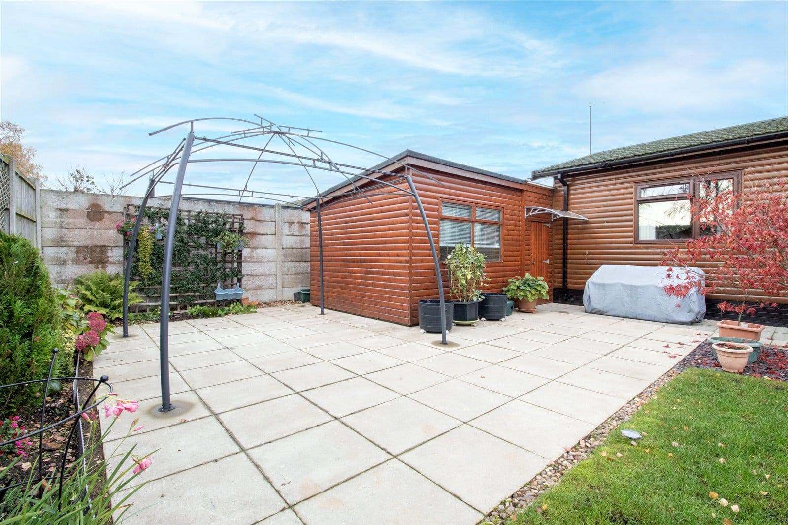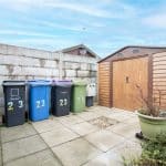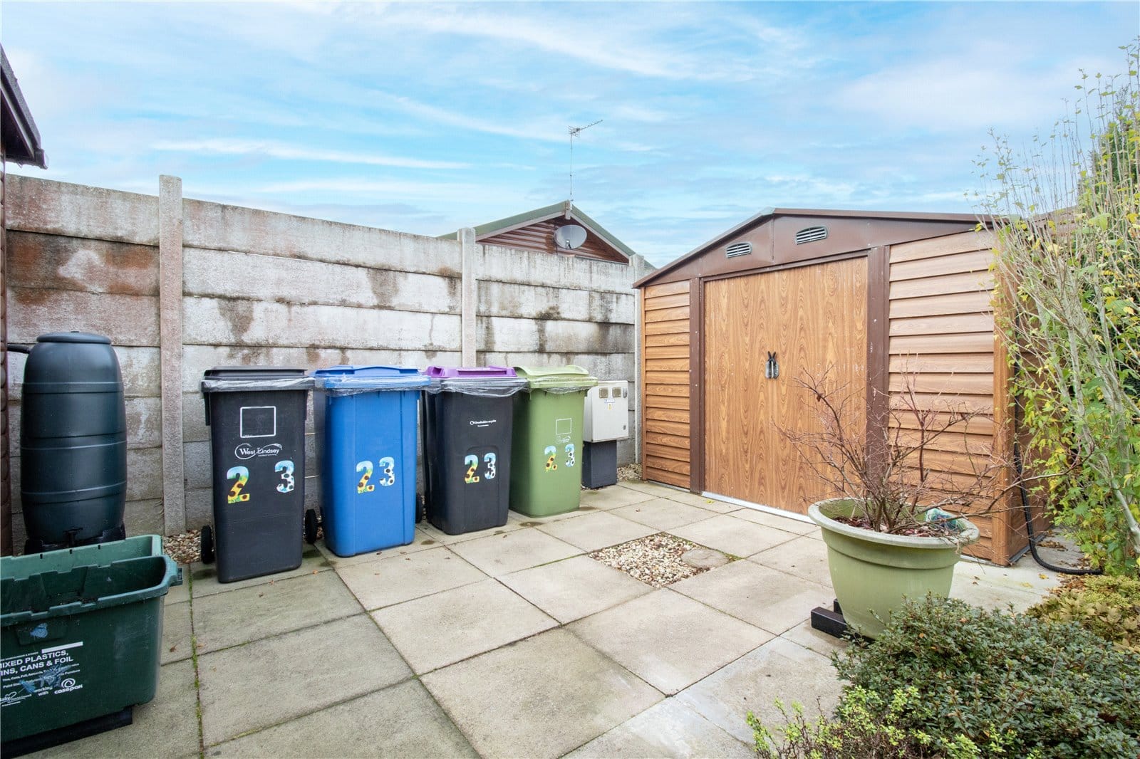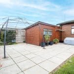 Externally, the property occupies a double plot, offering two separate lawned gardens. The main garden is thoughtfully designed with a paved patio area, perfect for outdoor entertaining. The second garden area includes a practical storage shed.