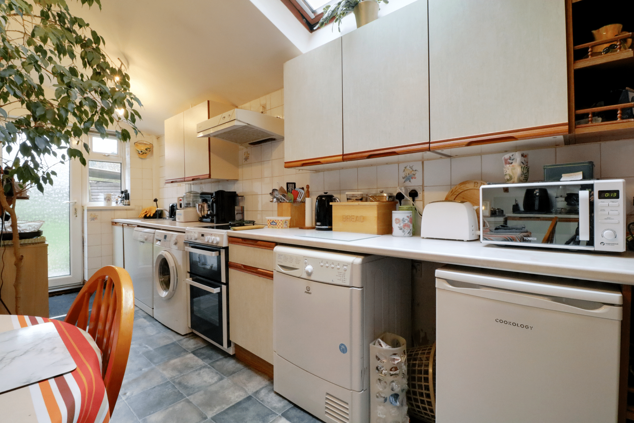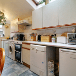 Dimensions: 3.74m x 5.04m. With a rear uPVC double glazed entrance door with an inset patterned with an adjoining window allowing access to the rear garden and a Velux wooden glazed skylight. The kitchen includes a range of low level units, drawer units and wall units with a patterned working top surface incorporating a single stainless steel sink unit, plumbing for an automatic washing machine, dishwasher, space for a free standing cooker, further space for an undercounter tumble dryer, vinyl flooring, splash backs throughout and an internal door allows access through to;