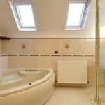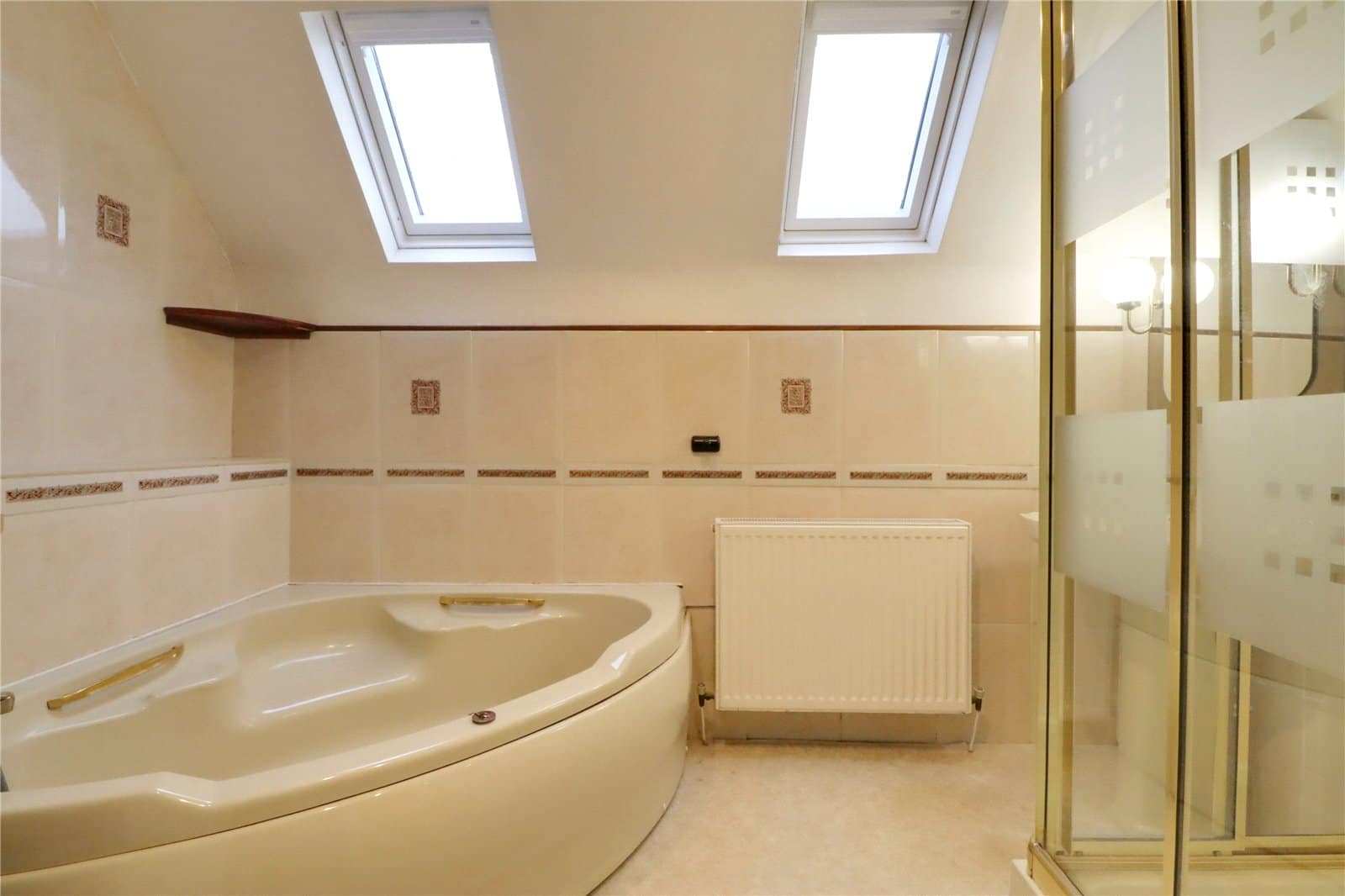 Twin side Velux double glazed roof lights providing a four piece suite comprising a low flush WC, pedestal wash hand basin, corner fitted panelled bath with moulded seat, separate shower cubicle with electric shower and glazed screen, tiling to walls and further loft access.