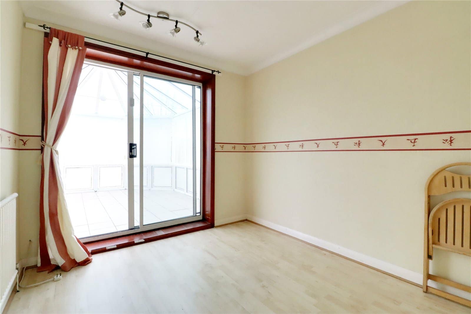 With internal aluminium framed double glazed sliding patio doors leading to the conservatory, wall to ceiling coving and laminate flooring.