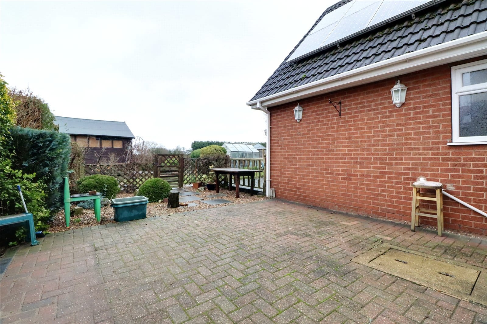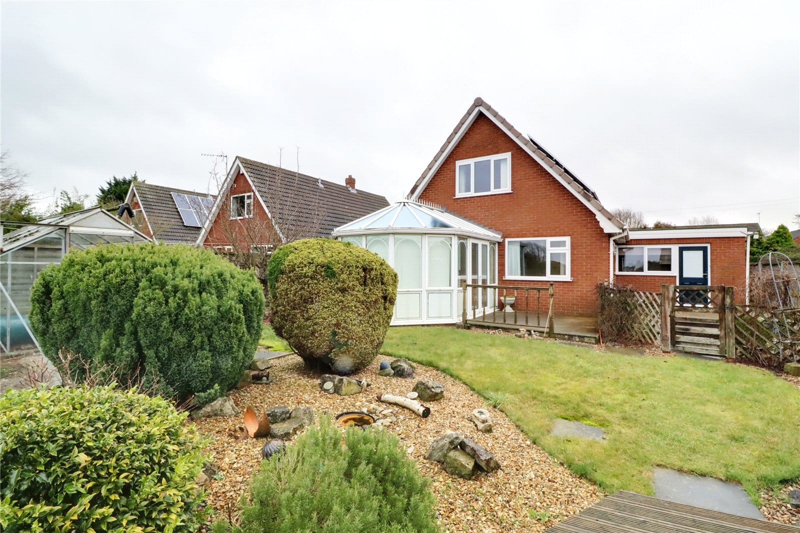 To the front of the property enjoys a shaped lawned garden with pebble and shrub filled borders, front brick boundary wall with vehicular access to a driveway leading to an integral garage. Pathways down either side lead to a private south westerly facing garden enjoying excellent open countryside views, a central shaped lawn, deep pebbled borders with planted shrubs and decked seating area.
