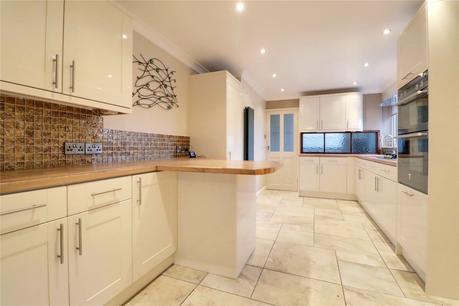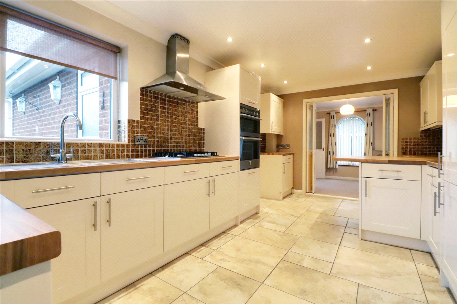 Rear uPVC double glazed window and doors through to the utility. The kitchen enjoys an extensive range of gloss white finished shaker style furniture with brushed aluminium style pull handles with a butcher block style worktop with tiled splash backs incorporating a one and a half bowl stainless steel sink unit with drainer to the side and block mixer tap, built-in five ring gas hob with oven beneath and overhead canopied extractor and eye level double oven, projecting breakfast bar, tiled flooring, wall to ceiling coving and inset ceiling spotlights.