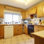 With a side uPVC double glazed window. The kitchen includes a range of oak fronted low level units, drawer units and wall units with rounded pull handles and a pattened working top surface incorporating a single ceramic sink bowl unit with block mixer tap and drainer to the side, built-in Lamona electric oven with further integral electric oven and matching grill, plumbing for a washing machine, separate breakfast bar area, tiled flooring, space for a tall fridge freezer, tiled walls and ceiling spotlights.