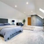 Providing three side double glazed roof lights with fitted blinds, an extensive range of bedroom furniture comprising hanging wardrobe, display shelving, desk and vanity unit, style wall radiator, inset ceiling spotlights, large airing cupboard with cylinder tank and doors through to;