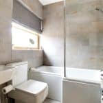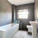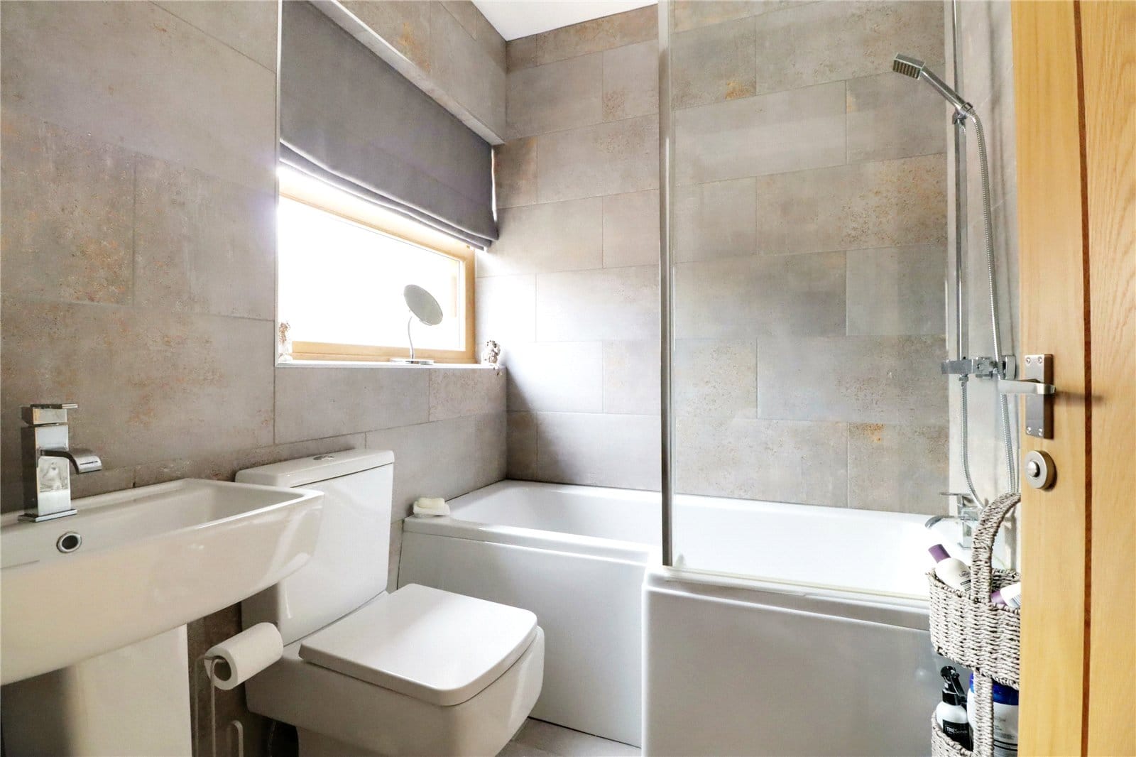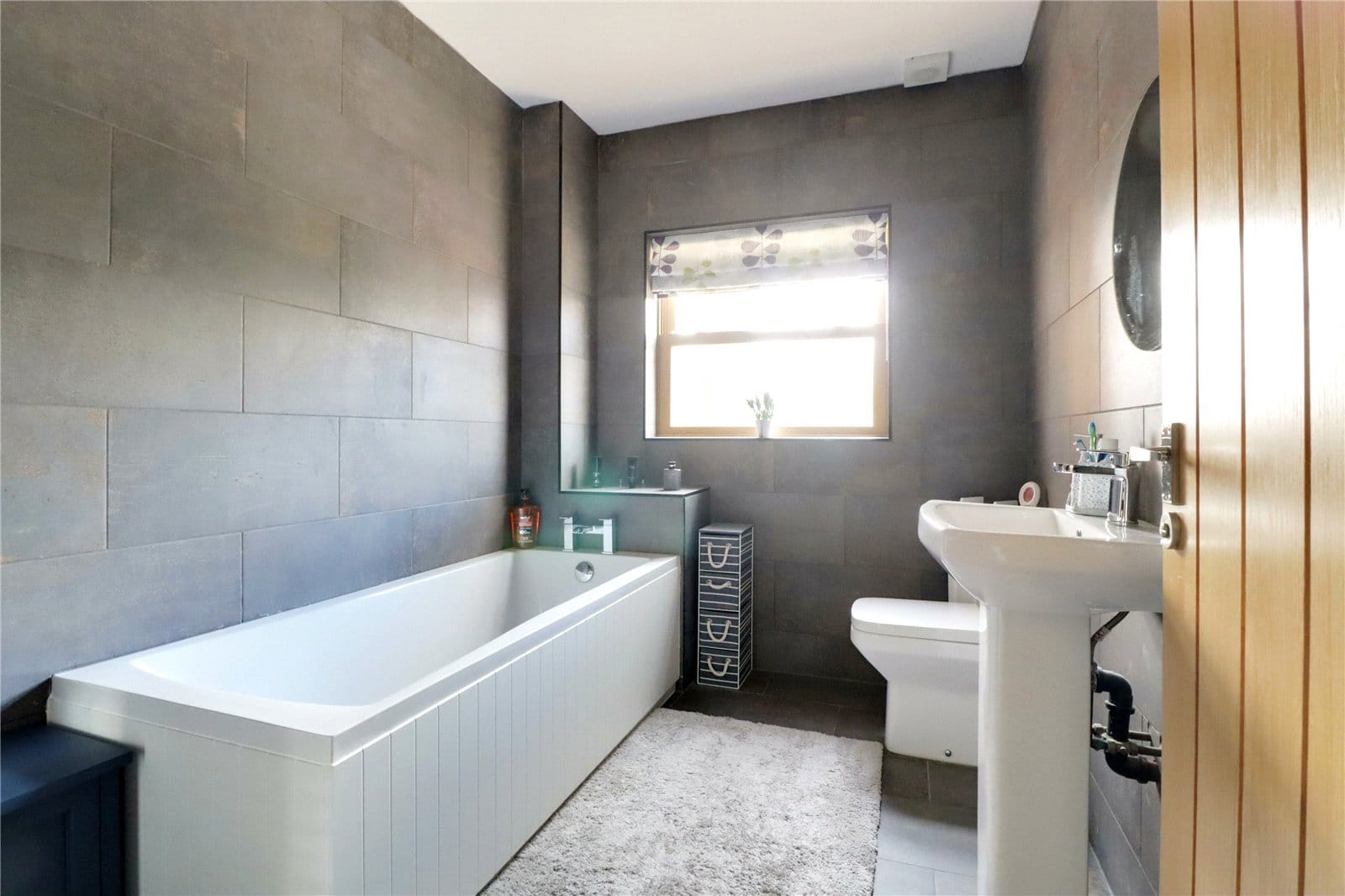 With front uPVC vertical sliding double glazed sash window with patterned glazing, providing a modern suite in white comprising a low flush WC, pedestal wash hand basin, panelled bath, tiled flooring, fully tiled walls with black edging and large chrome towel rail.