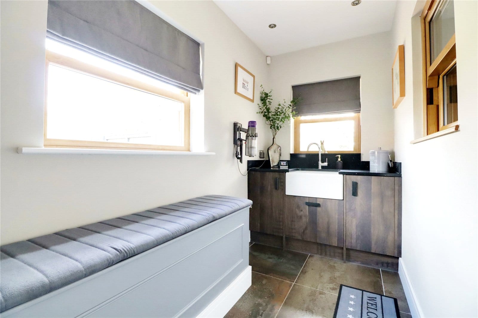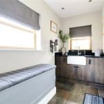 Enjoying front and side vertical sliding light wood grain effect uPVC double glazed windows, matching stable style entrance door, built-in boiler cupboard, low level storage with cushioned seating above, feature Belfast ceramic sink surrounded by a granite top with matching uprising with stylish units beneath, tiled flooring with underfloor heating, ceiling spotlights and oak doors leads through to;
