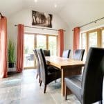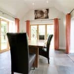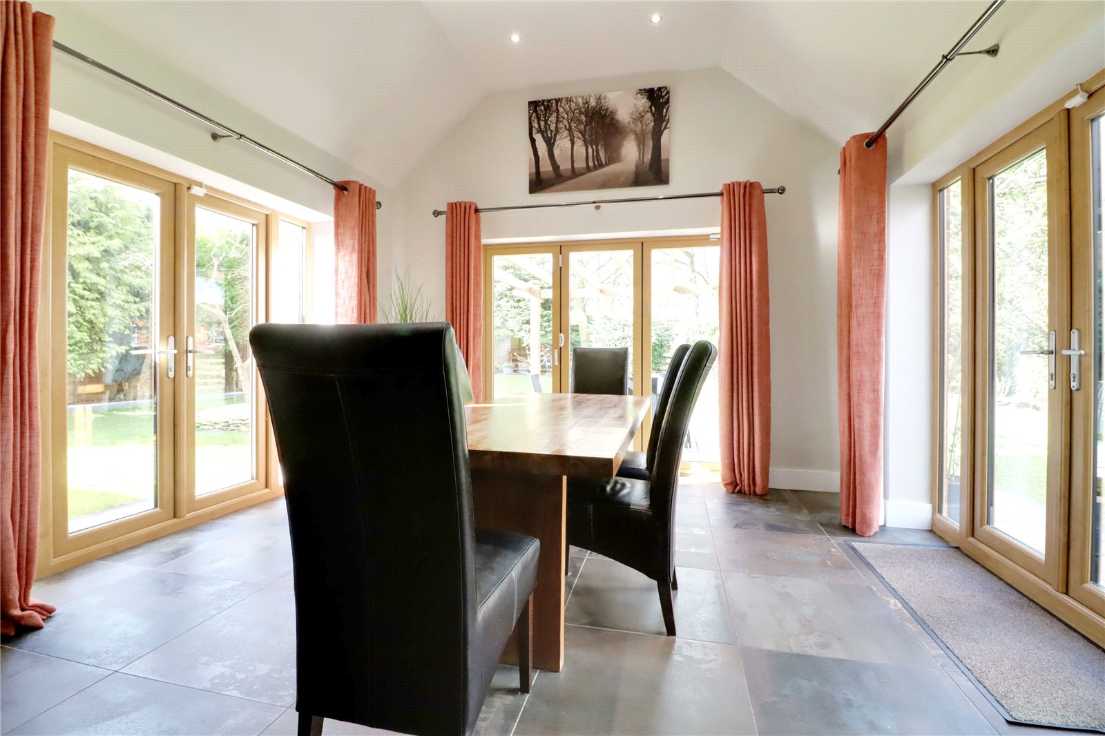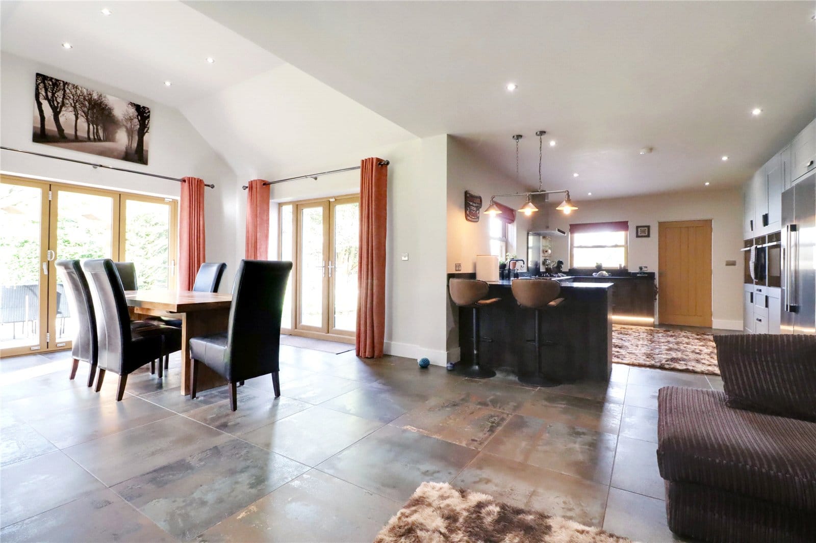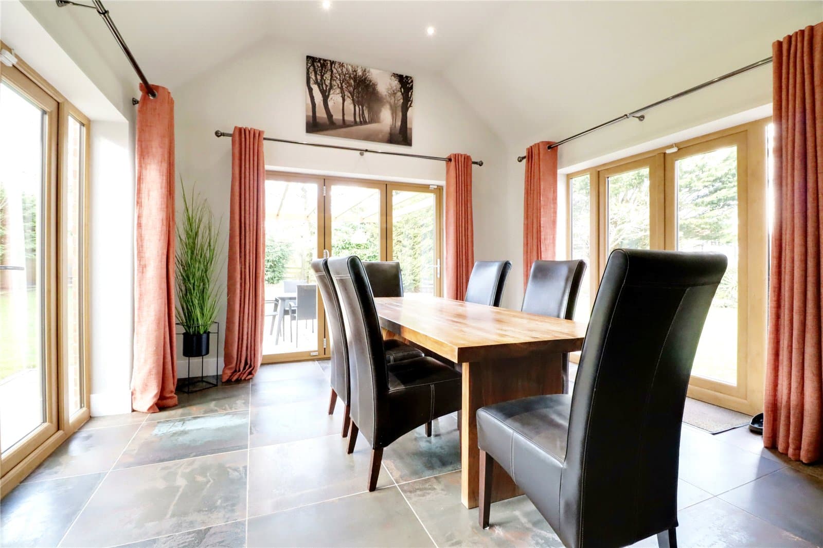 Enjoying front and rear light wood grain effect uPVC double glazed French doors with adjoining side light that leads to the garden and matching bi-folding doors leading to a pleasant seating area, continuation of tiled flooring with underfloor heating and vaulted ceiling with inset ceiling spotlights.