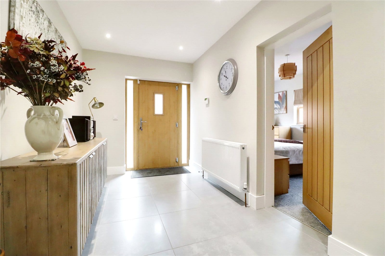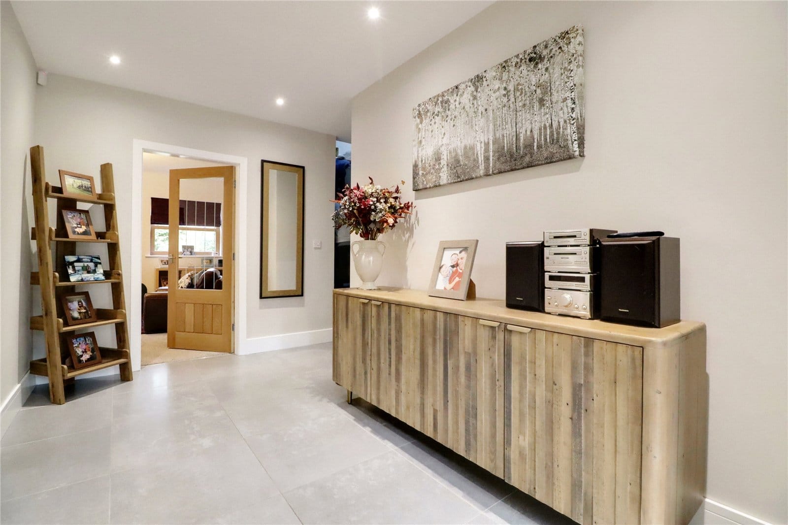 With side light wood grain effect uPVC double glazed entrance door with patterned glazing and adjoining side light, tiled flooring, inset ceiling spotlights, return staircase allowing access to the first floor accommodation with open spell balustrading and understairs storage, large built-in storage cupboard with shelving.