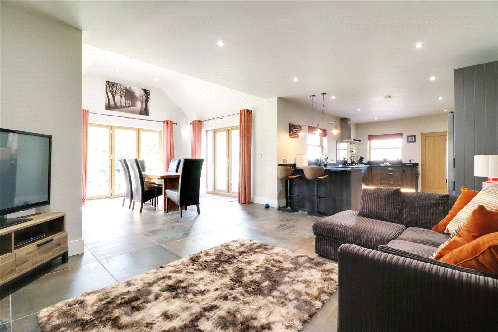 The property occupies a substantial elevated plot in the heart of the village with views across the church and offers vehicle access via brick pillars and a traditional five bar timber gate onto a substantial block and pebbled driveway that allows parking for a large number of vehicles and direct access to both garages. Gardens adjoining the driveway come lawned with hedged boundaries with a sheltered entrance door having a patio area for entertaining. Gated access to the side leads to a private enclosed landscaped garden that comes principally lawned with mature borders and enjoys a newly laid Indian slate patio that surrounds the property and provides a number of seating areas.