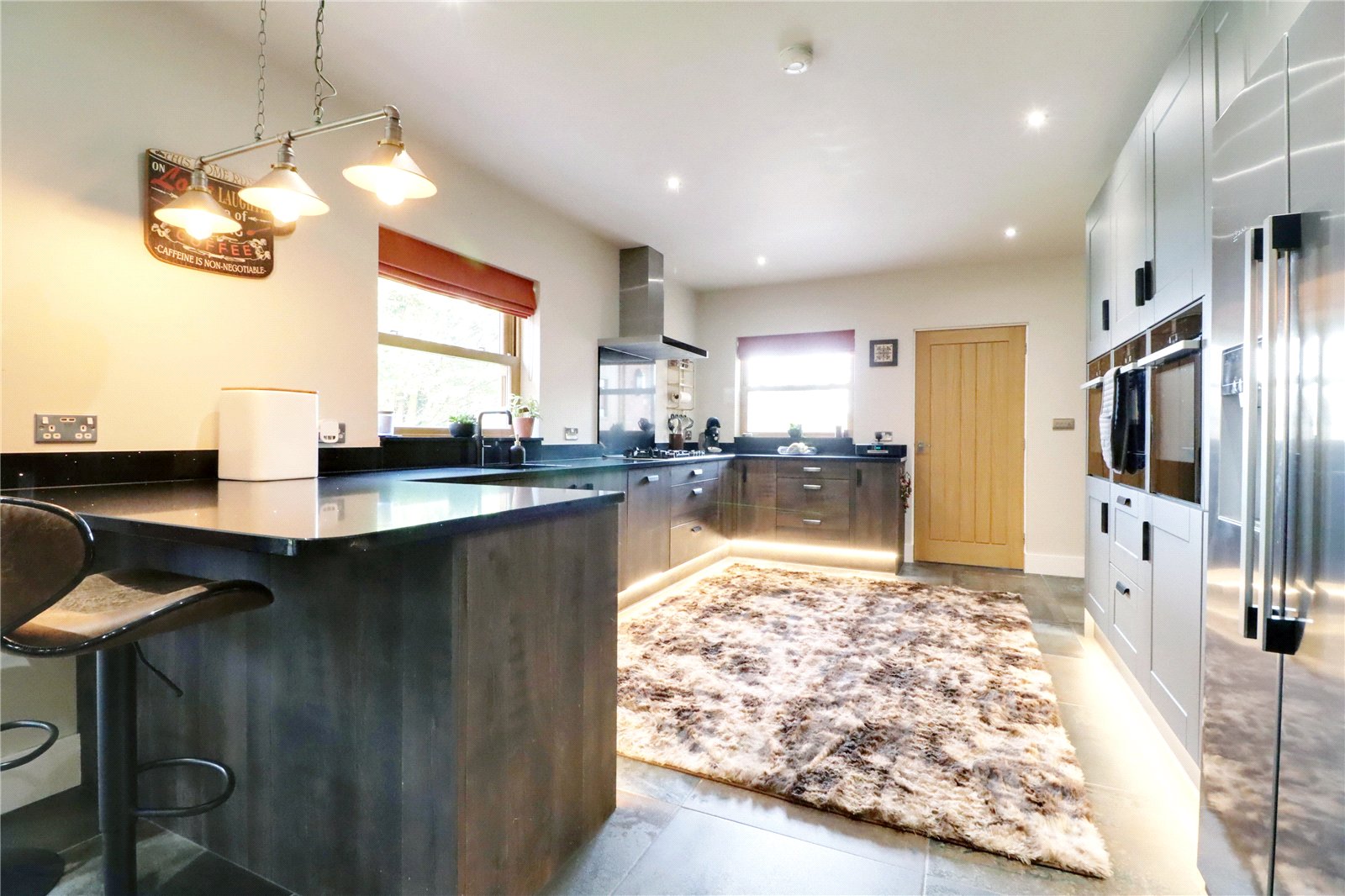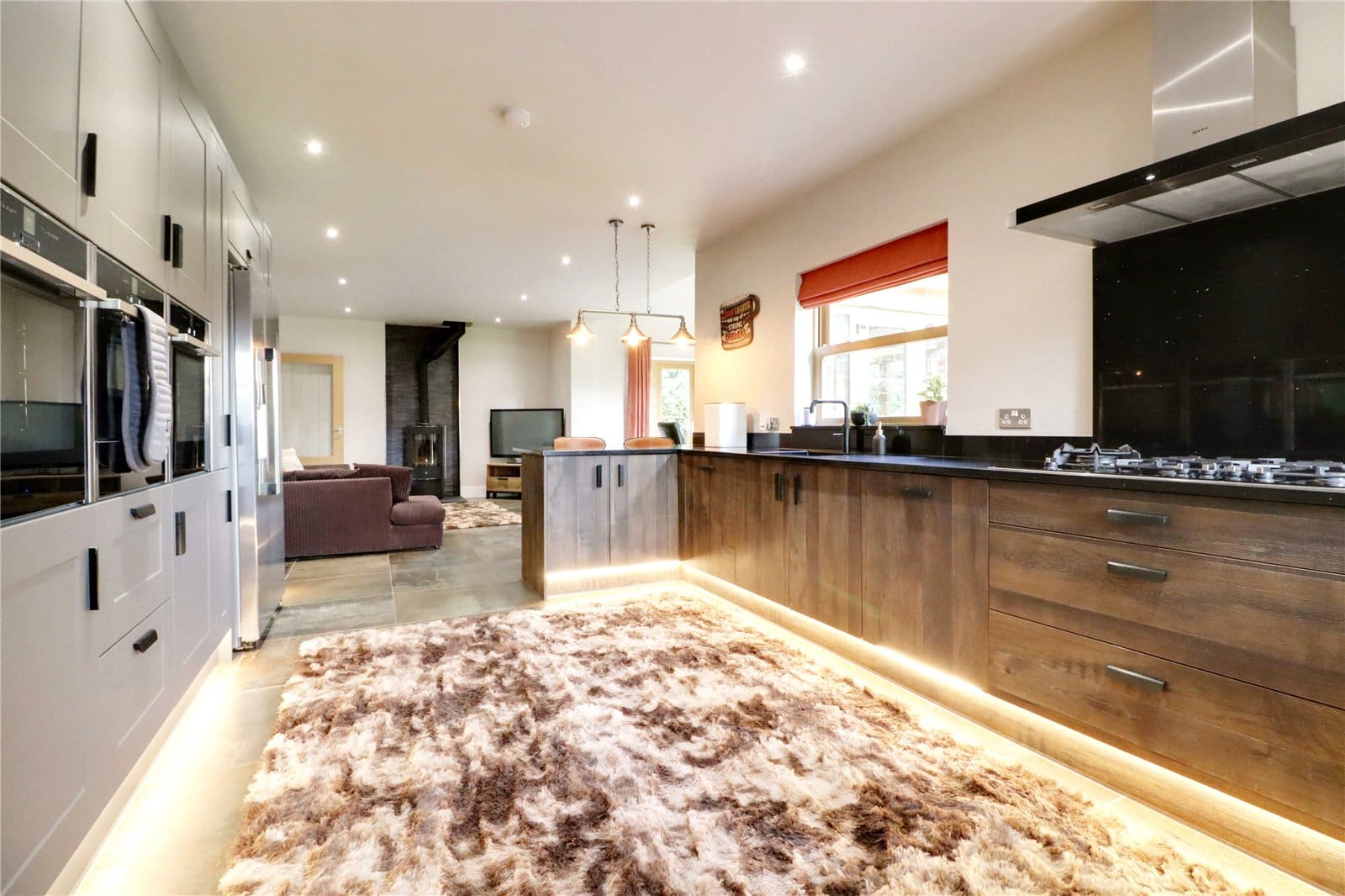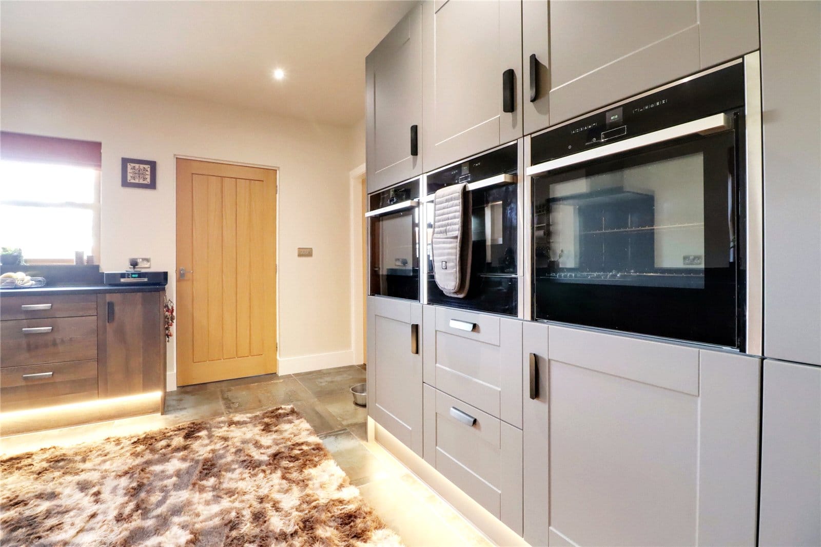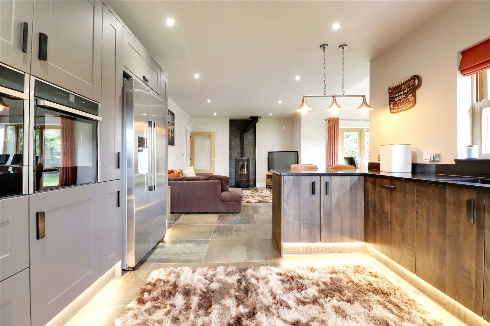 Enjoying a dual aspect with front and side uPVC vertical sliding sash windows and a broad opening to a formal dining. The kitchen enjoys an extensive range of fitted furniture being contrasting grey shaker style and wooden effect with matching black curved cupped pull handles, with integral appliances and a feature granite worktop with matching uprising incorporating a single sink unit with etch drainer to the side and quooker tap, five ring Neff gas hob with overhead broad canopied extractor, eye level Neff double oven, microwave and warming drawer, space for an American style fridge freezer, feature tiled flooring with underfloor heating, stylish multi fuel cast iron stove on a raised slate hearth with matching slate tiled backing and inset modern ceiling spotlights.