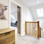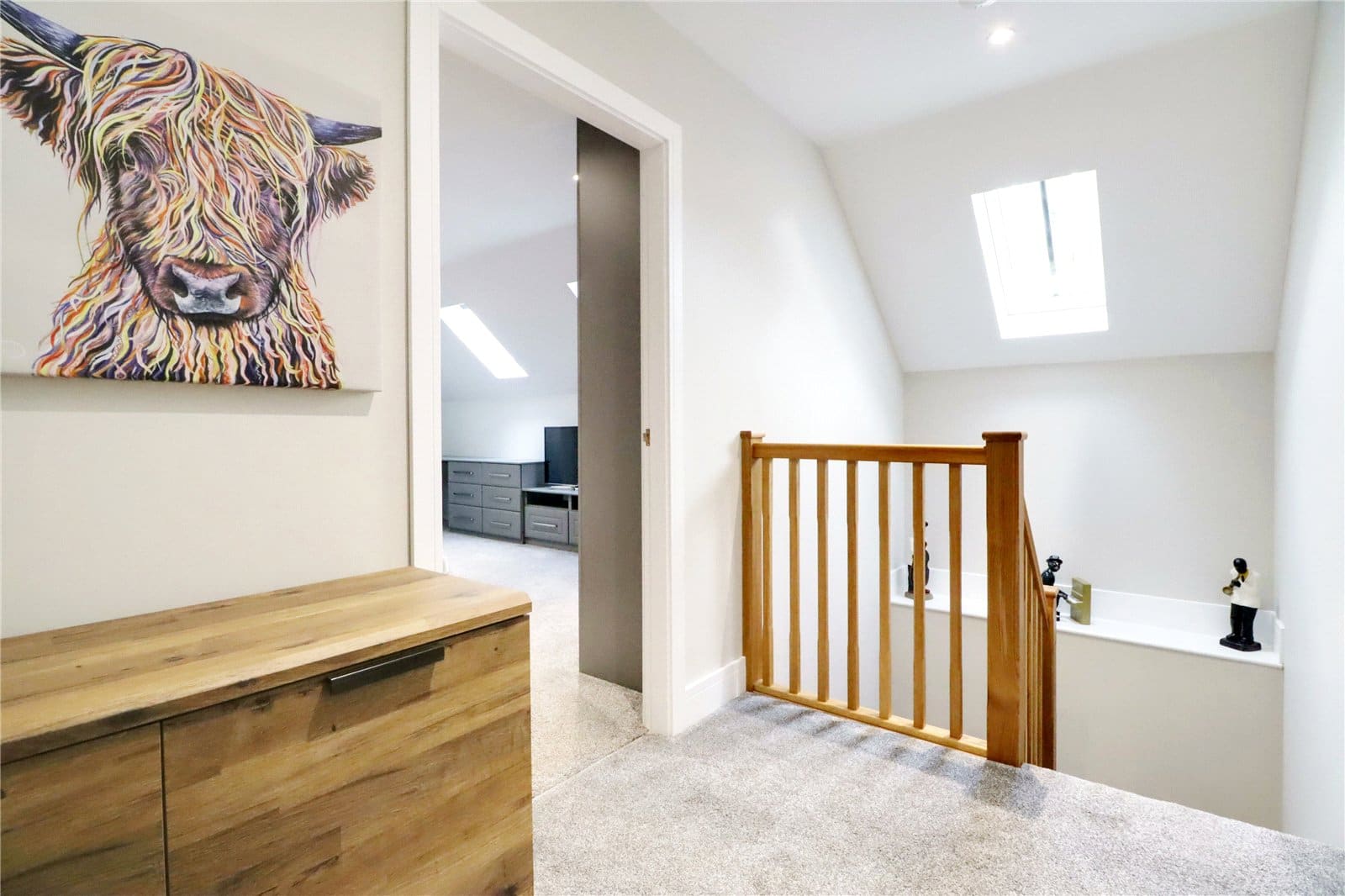 With side double glazed roof light, continuation of oak balustrading, eaves storage and doors through to;