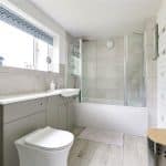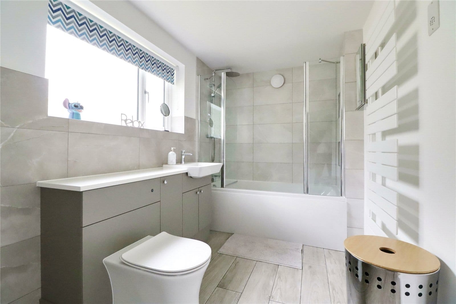 Rear uPVC double glazed window with inset patterned glazing, fitted with a panelled bath with shower over and glazed screen, close couple low flush WC with adjoining vanity unit with polished white top above and an inset wash hand basin, tiled flooring, part tiling to walls with chrome edging, fitted towel rail and shavers socket.