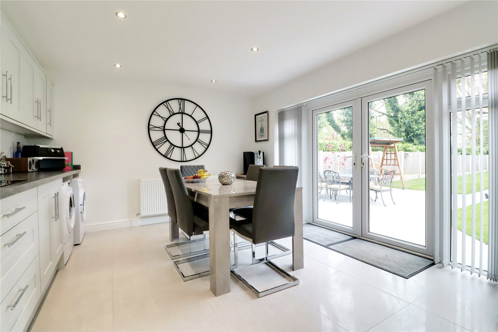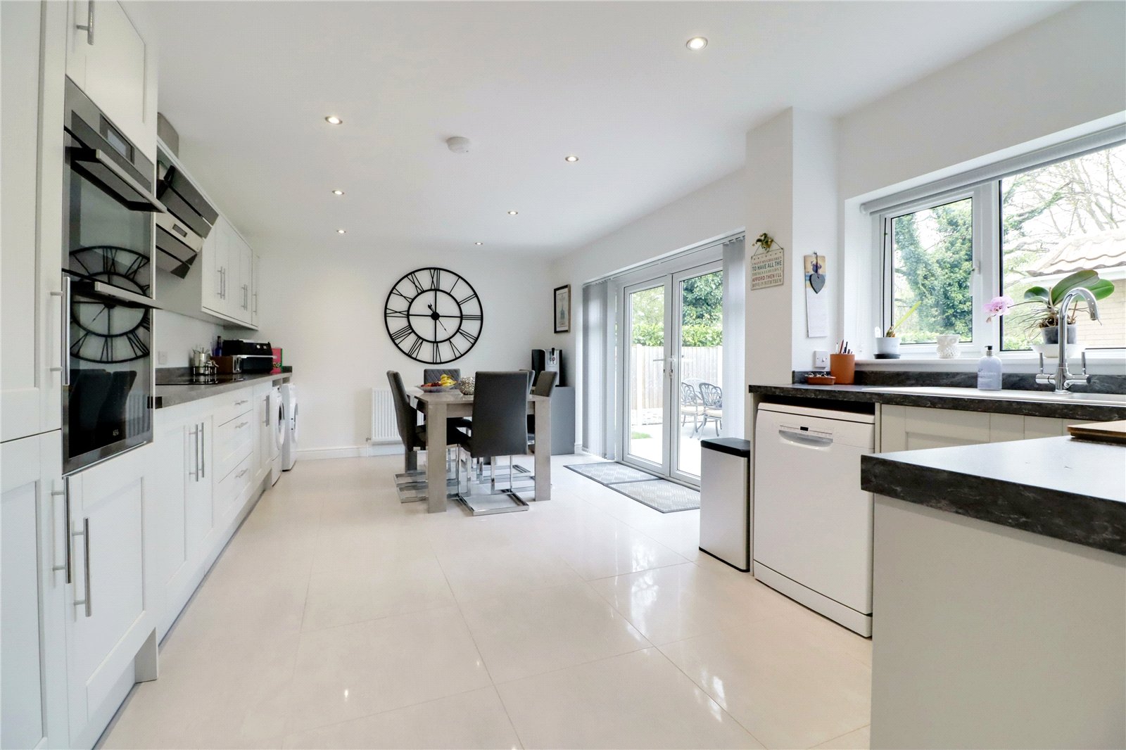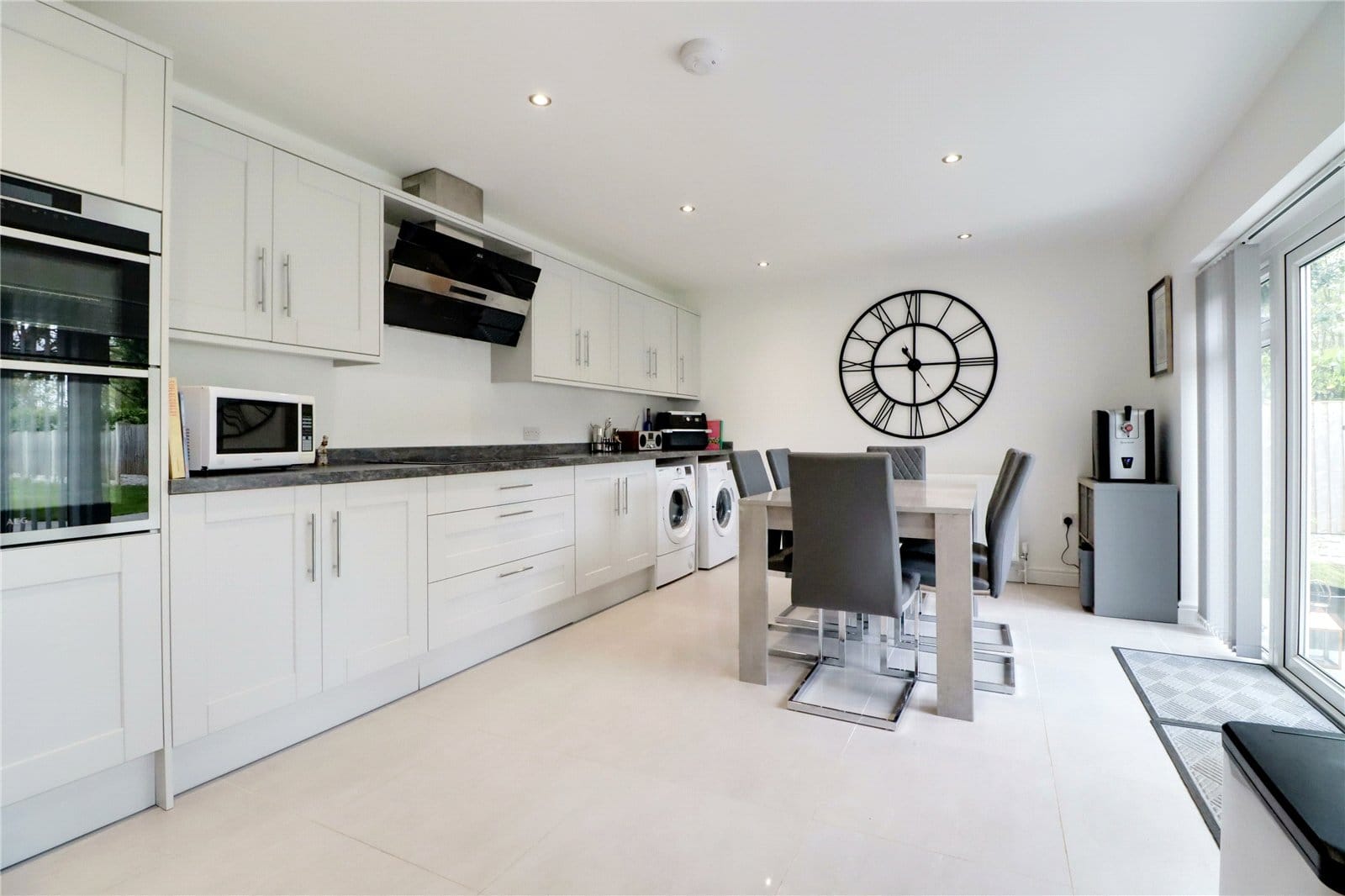 Side uPVC double glazed window and matching French doors with adjoining side light leads out to a courtyard style garden. The kitchen enjoys an extensive range of shaker style furniture with brushed aluminium style pull handles with a complementary patterned top with matching uprising that incorporates a broad single bowl sink unit with drainer to the side and chrome block mixer tap, built-in four ring electric induction hob with matching canopied extractor with eye level double oven, space and plumbing for appliances, ceramic tiled flooring, inset ceiling spotlights and space and plumbing for an American style fridge freezer.