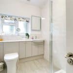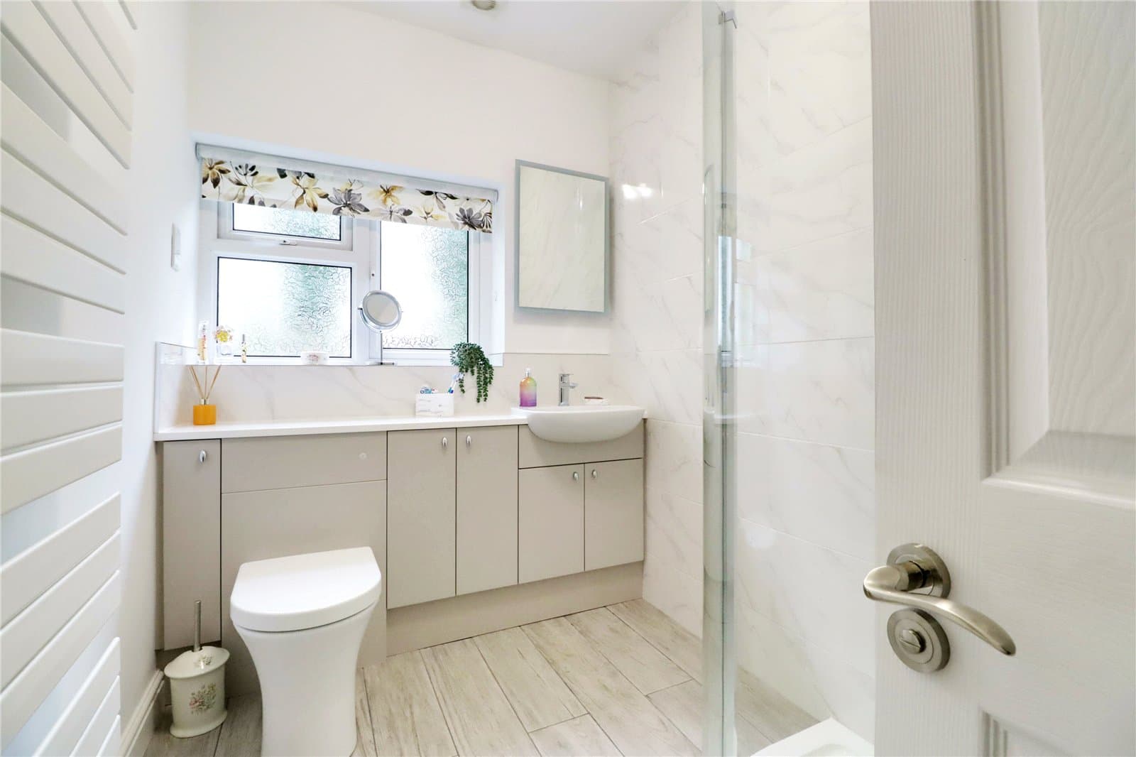 Rear uPVC double glazed window with inset patterned glazing, providing a quality suite in white comprising a walk-in shower cubicle with main shower and curved glazed screen, closed couple low flush WC and adjoining vanity units with chrome pull handle, polished white top with wash hand basin, tiled flooring, part tiling to walls with chrome edging and fitted towel rail.