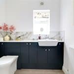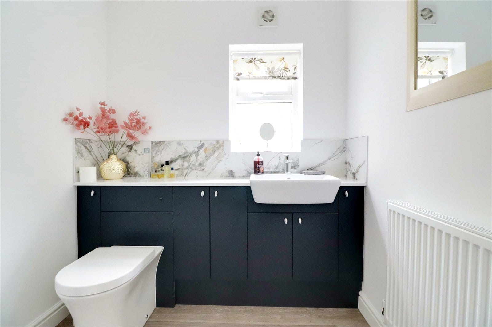 Rear uPVC double glazed window with patterned glazing, enjoying a quality suite in white comprising close couple low flush WC with adjoining Royal Blue vanity units with chrome pull handles and a polished white top above incorporating a wash hand basin and tiled backing, wooden style luxury style flooring and inset ceiling spotlights.