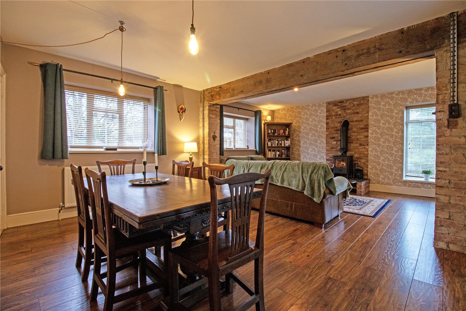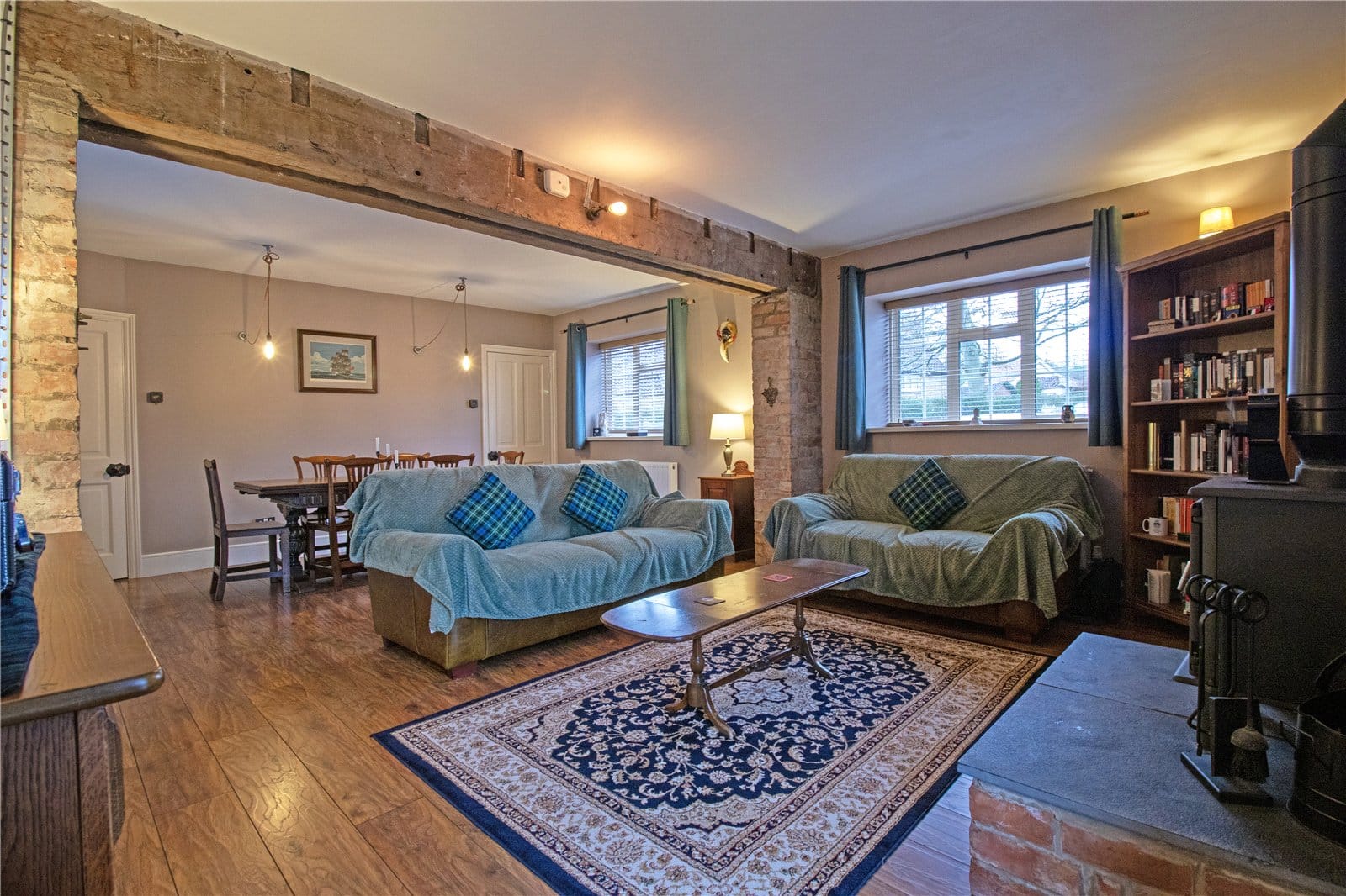 The accommodation is both generous and versatile. A superbly proportioned lounge diner enjoys multi-aspect views, flooding the space with natural light, while a feature log-burning stove creates a cosy focal point — perfect for relaxed evenings or entertaining guests. The stunning fitted dining kitchen is undoubtedly the heart of the home, boasting dual-aspect views, elegant quartz worktops and a high-quality finish throughout. A delightful garden room provides additional reception space, ideal as a snug, playroom or home office, and is complemented by a separate utility room and ground floor WC for practicality.