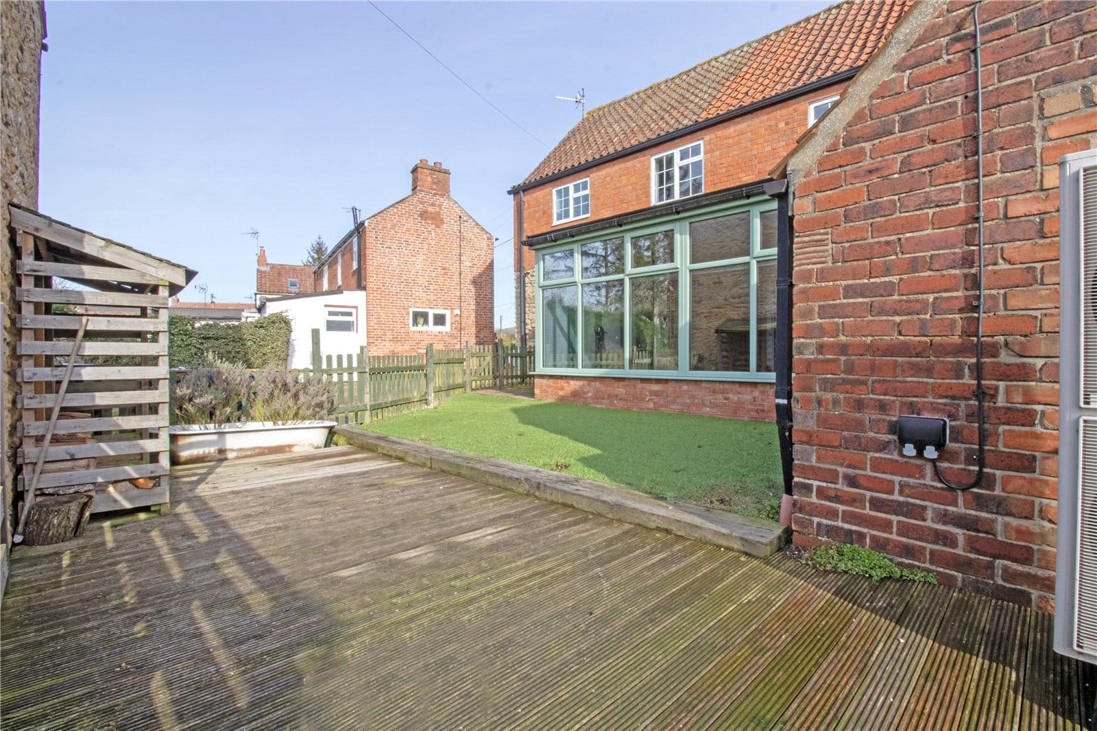 Externally, the property continues to impress. Ample off-road parking is provided to the rear, alongside a wood-decked entertaining terrace — perfect for summer gatherings and alfresco dining. The remainder of the garden has been thoughtfully designed with low-maintenance artificial lawn, all set against stunning open field views to the rear.
