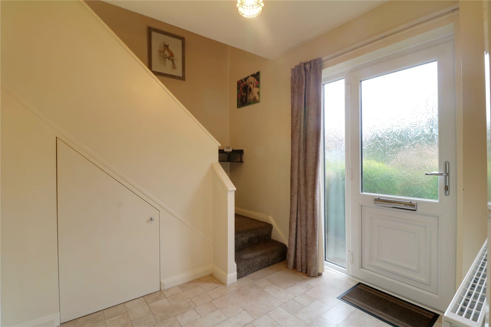 Includes a front uPVC double glazed entrance door with inset patterned glazing with adjoining side light with further inset patterned glazing, a dog legged staircase leads to the first floor accommodation with a built-in under the stairs storage cupboard, vinyl flooring and internal doors allow access off to;