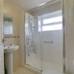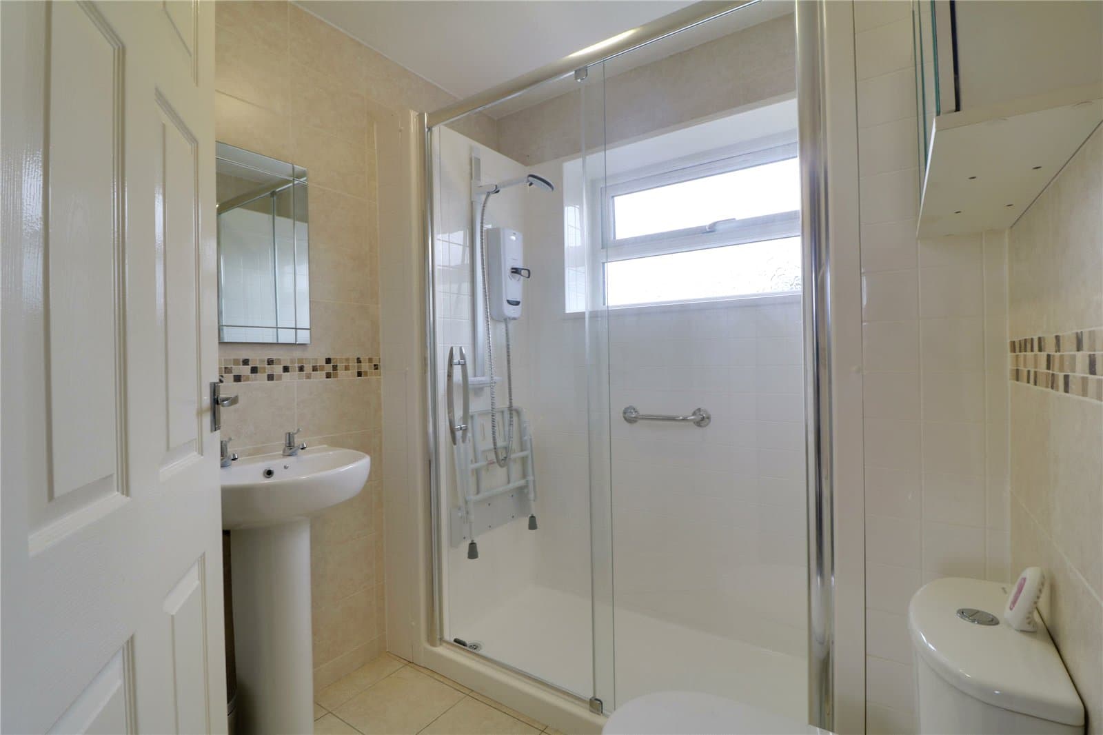 With a front uPVC double glazed window with frosted glazing, a double walk-in shower cubicle with overhead Mira electric shower with tiled splash backs, a low flush WC, pedestal wash hand basin, tiled flooring and tiling to the walls.