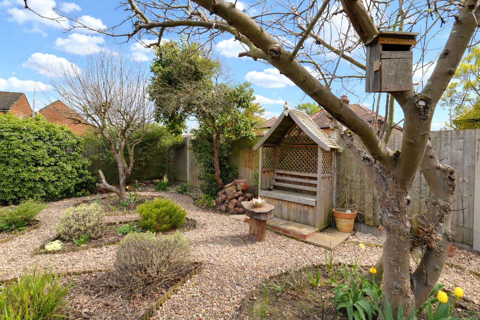 Externally, the property benefits from excellent kerb appeal, featuring a double driveway providing ample off-road parking with overhead car port and alongside is a neatly maintained lawn enclosed by a low-level brick wall. To the rear, a fully enclosed landscaped garden offers a laid-to-lawn area with fully stocked gravel/bark topped borders and an excellent raised patio seating area, ideal for outdoor entertaining.