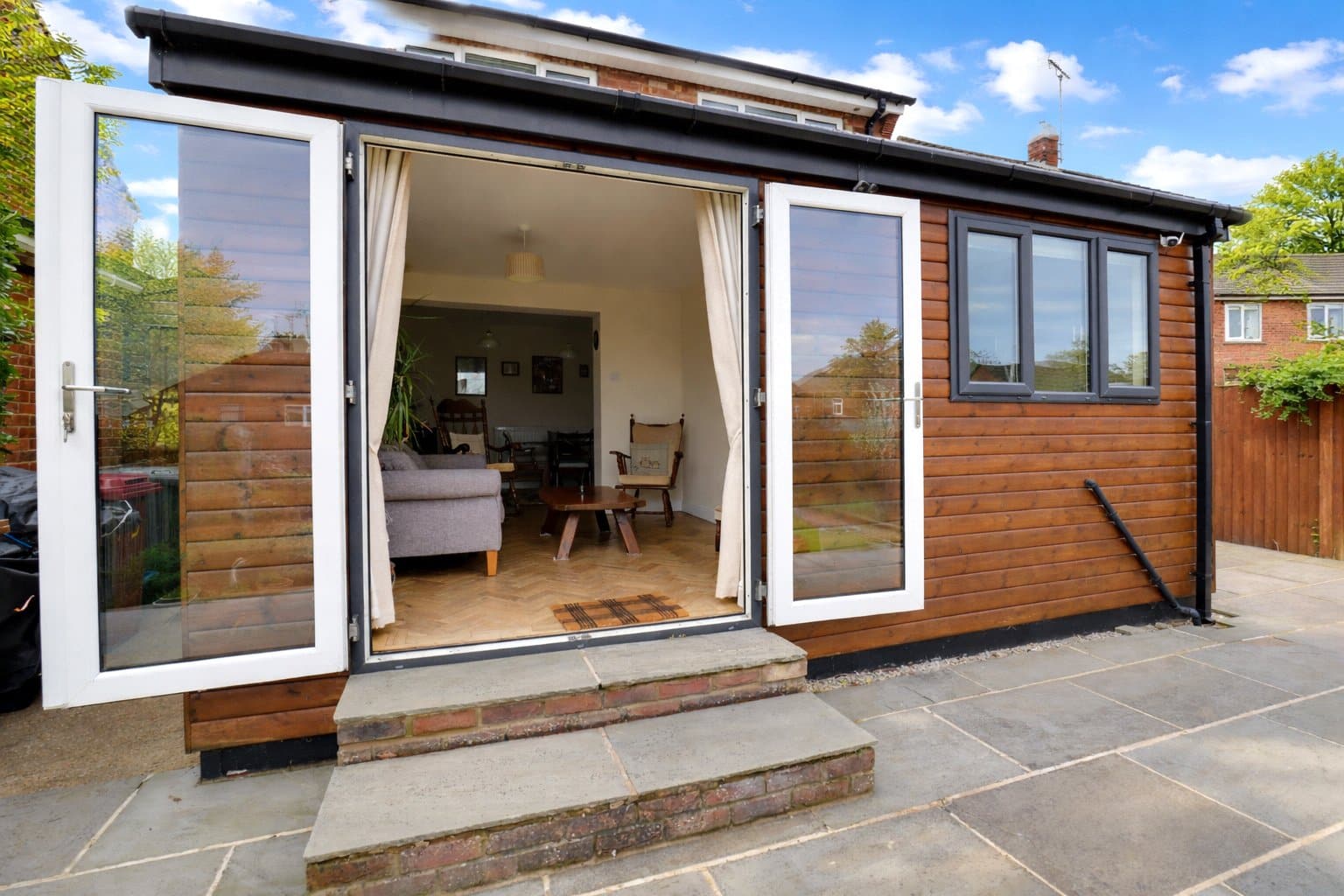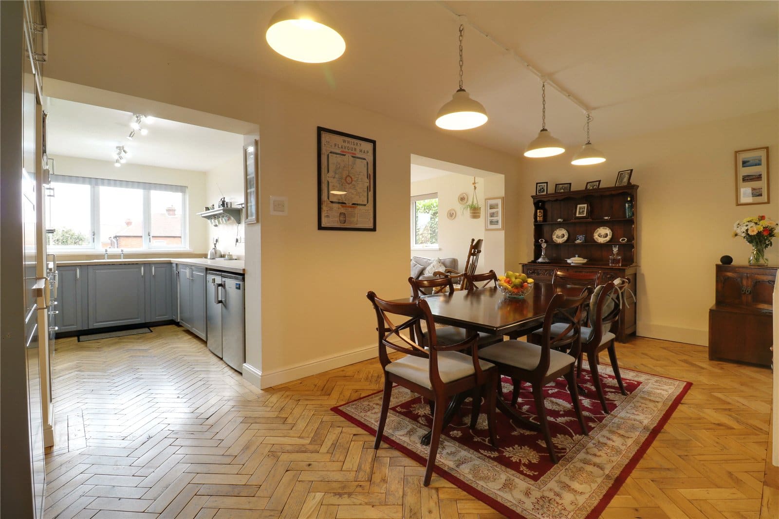 The ground floor comprises a welcoming entrance hall, a well-proportioned lounge with stunning feature wood burning stove, and a contemporary fitted kitchen which opens seamlessly into a generous dining area. A thoughtfully designed rear extension provides additional living space, creating an ideal environment for both everyday family life and entertaining.