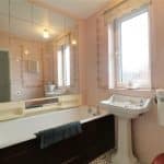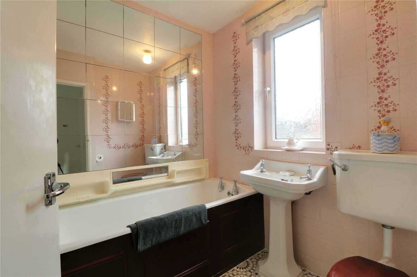 With a side uPVC double glazed window with frosted glazing providing a three piece suite comprising a panelled bath, low flush WC and a pedestal wash hand basin and tiled walls.