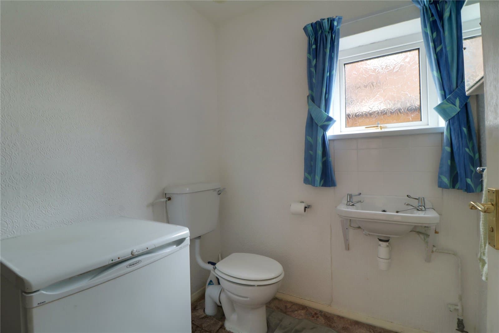 With a side uPVC double glazed window providing a two piece suite comprising a low flush WC and a wall mounted wash hand basin with tiled splash back and under the stairs storage.