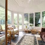 With surrounding hardwood double glazed window with matching French doors allowing access to the garden, slate tiled flooring and wooden clad ceiling with inset ceiling spotlights.