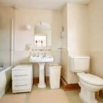 Rear hardwood vertical sliding double glazed sash window with patterned glazing providing a suite in white comprising a low flush WC, pedestal wash hand basin with tiled splash back and tiled flooring.